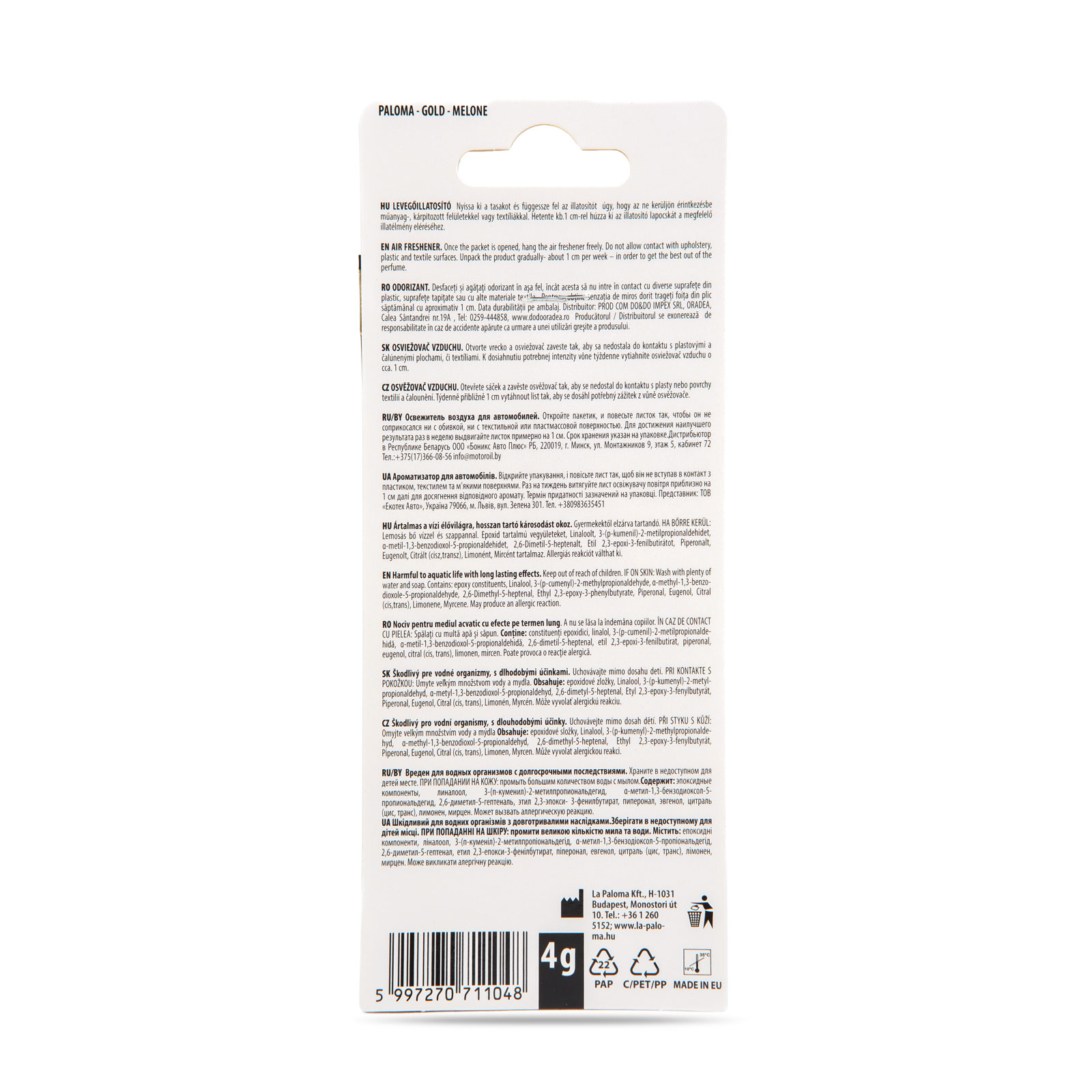Verfris de lucht in uw auto met de Paloma Gold luchtverfrisser en geniet elke kilometer van een prettige reis!