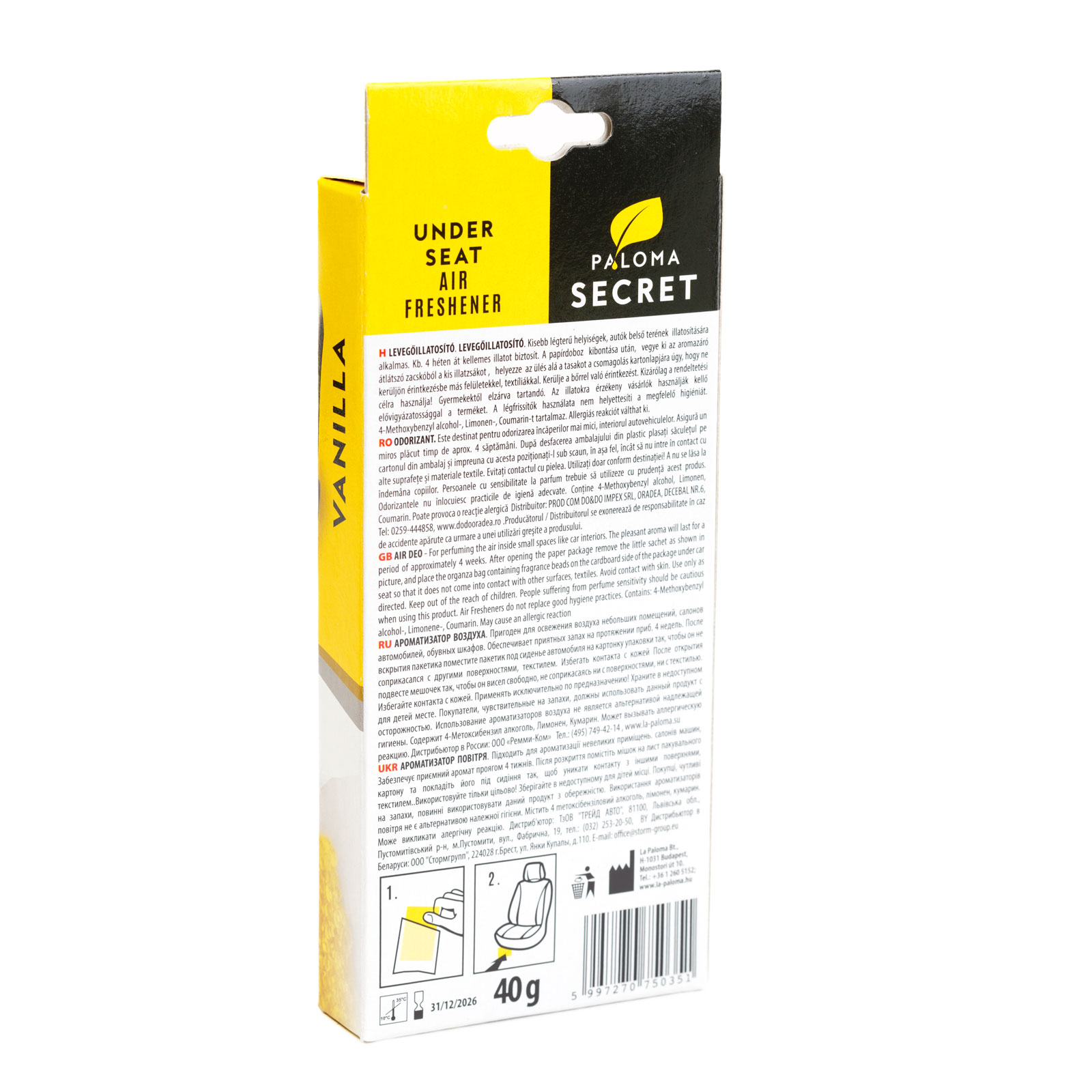 Geweldig product voor wie geen luchtverfrissers aan de achteruitkijkspiegel wil hangen, maar toch een frisse geur in de auto wil. De terecht succesvolle plastic balverpakking, bekend van de Paloma HappyBag-productlijn, die verborgen blijft onder de stoel, zorgt nog steeds voor een langdurige, aangename geur.