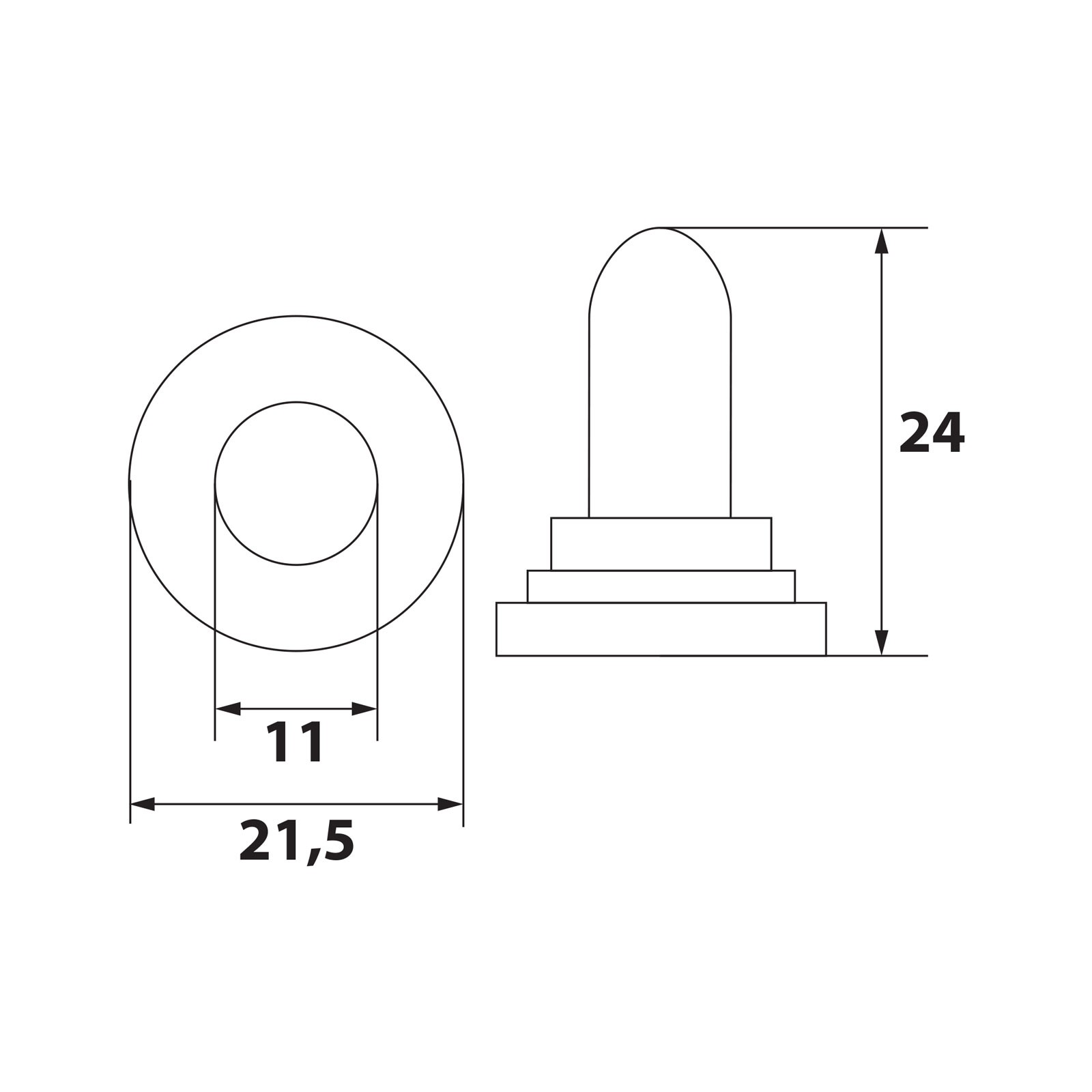 Binnendiameter: 11 mm Binnenlengte: 23,5 mm Buitendiameter: 21,5 mm Buitenlengte: 24 mm Materiaal: Rubber Integrale moer: M12 1 mm Kleur: Zwart