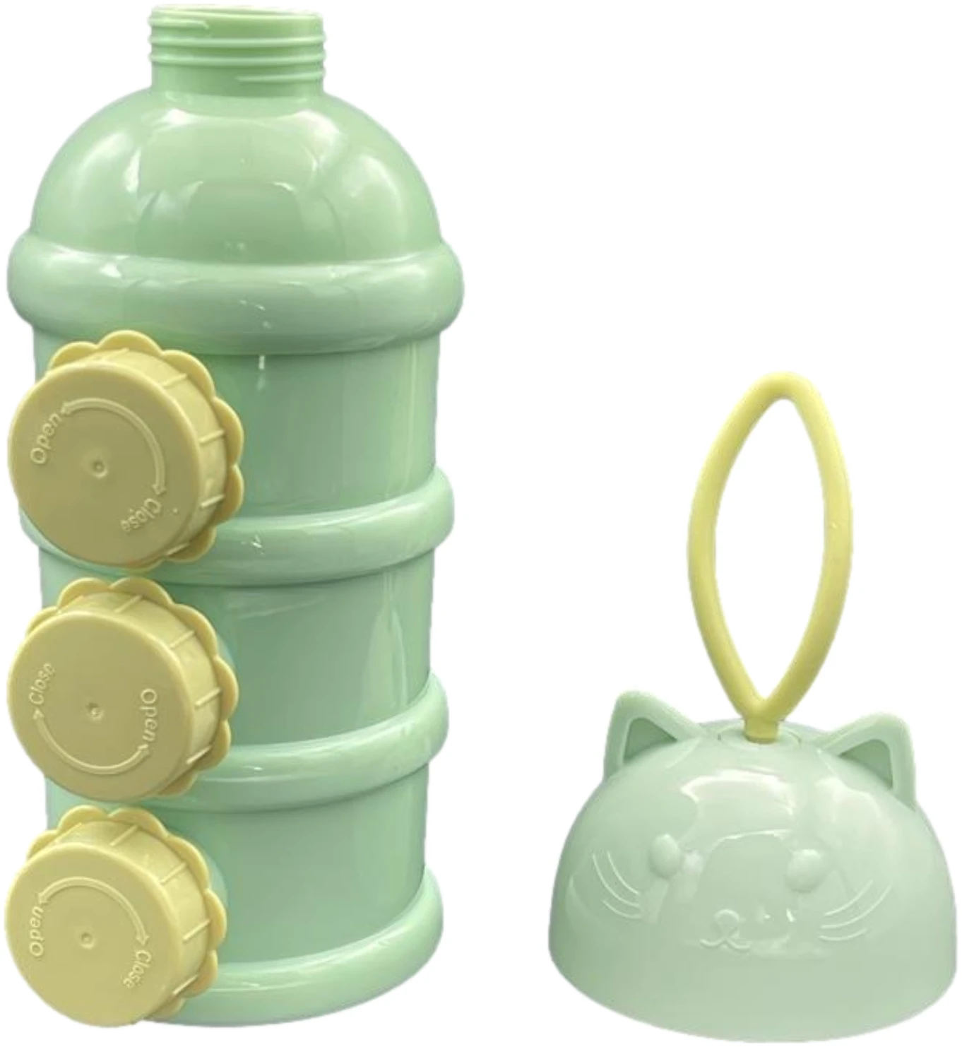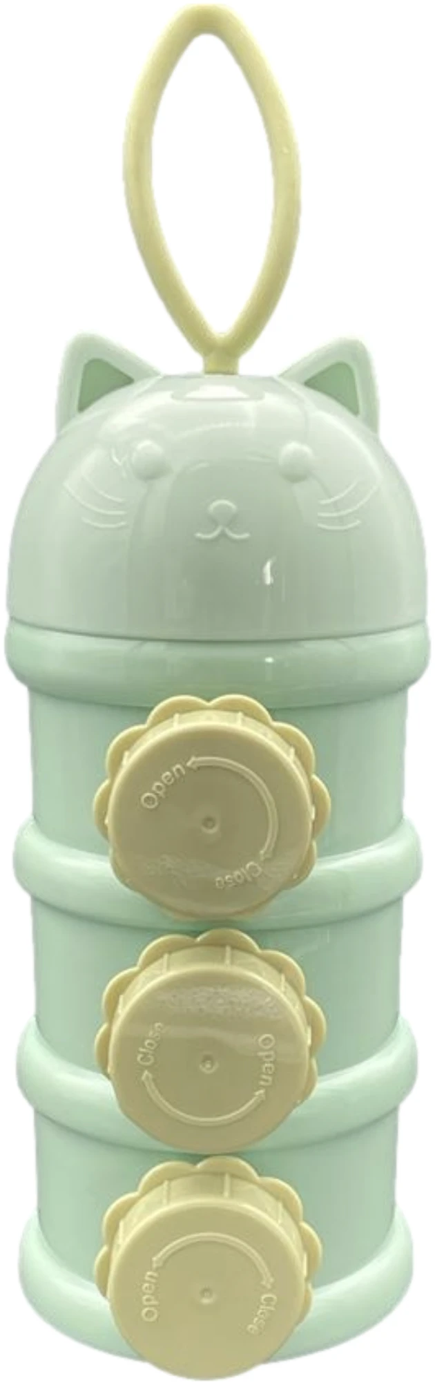Op elke verdieping zit een zijdop, om snel en makkelijk het melkpoeder in een flesje te gieten zonder te morsen en zonder gedoe van het verplaatsen van het onderste bakje naar de bovenkant. Zo ben je verzekerd dat je snel en gemakkelijk het poeder in het flesje schenkt!