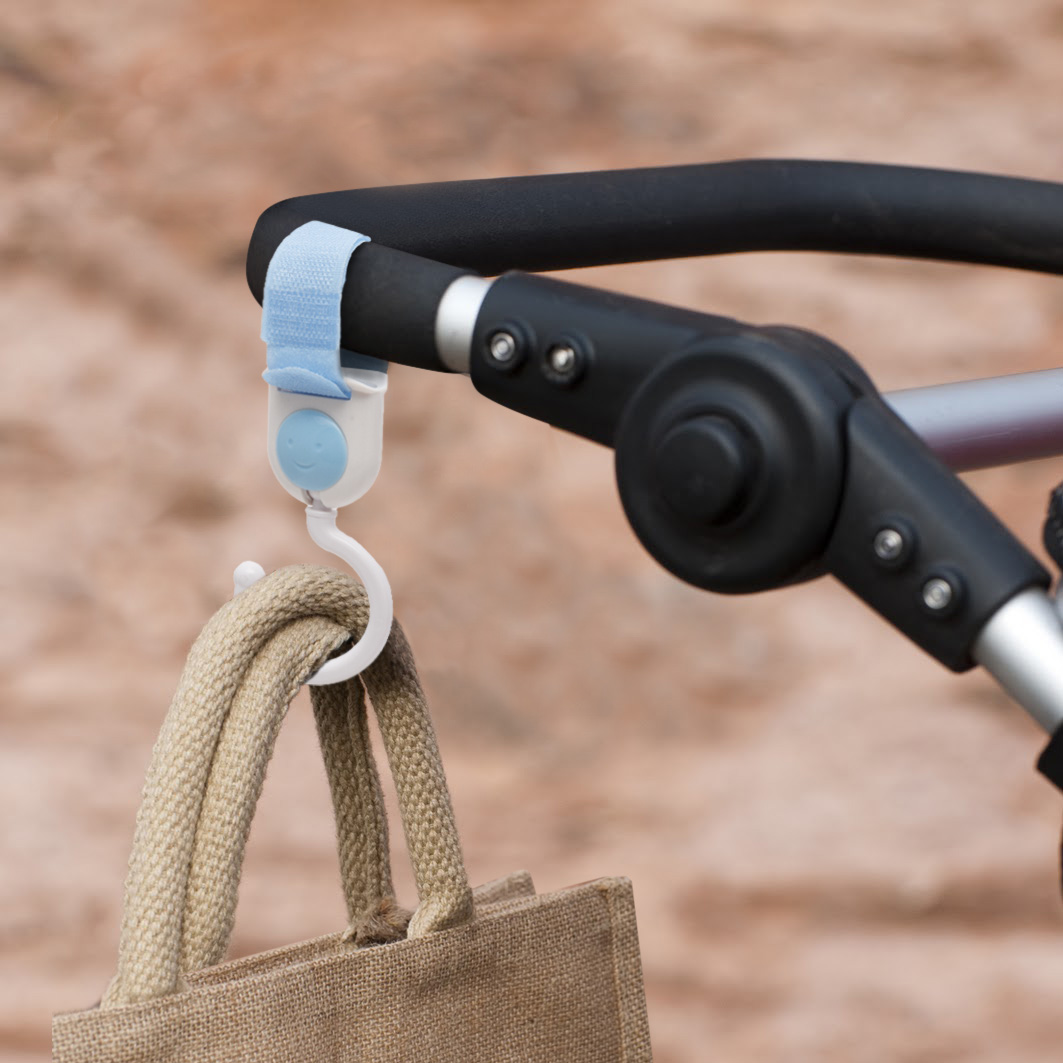 Universele hanger die met klittenband aan een kinderwagen of aan een babyzitje kan worden bevestigd. Er kunnen tassen en speelgoed aan gehangen worden.