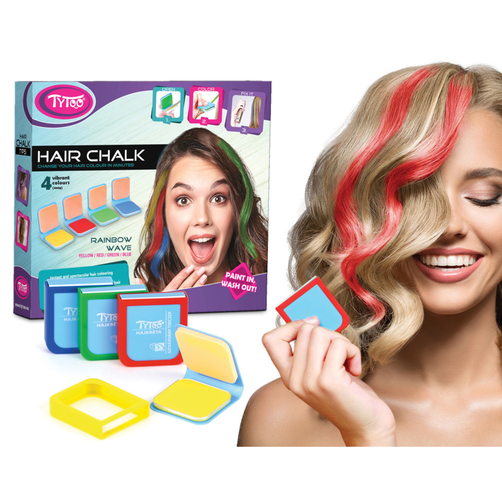 Make your hair shine in the colors of the rainbow with hair chalk to make your look even more unique. Make your hair special in just a moment with hair chalk! You can shine with bright colors every day and if you get bored, you can simply wash it out of your hair so that you can try new colors. So you can even change it daily according to your mood or your outfit. Enchant the world with a unique look, use hair chalk!