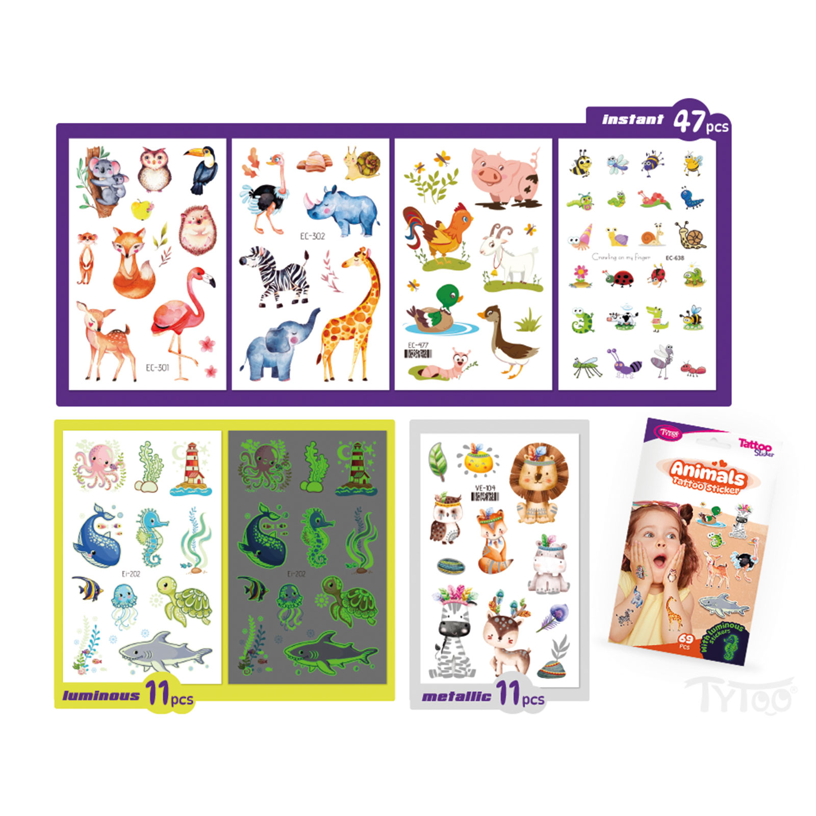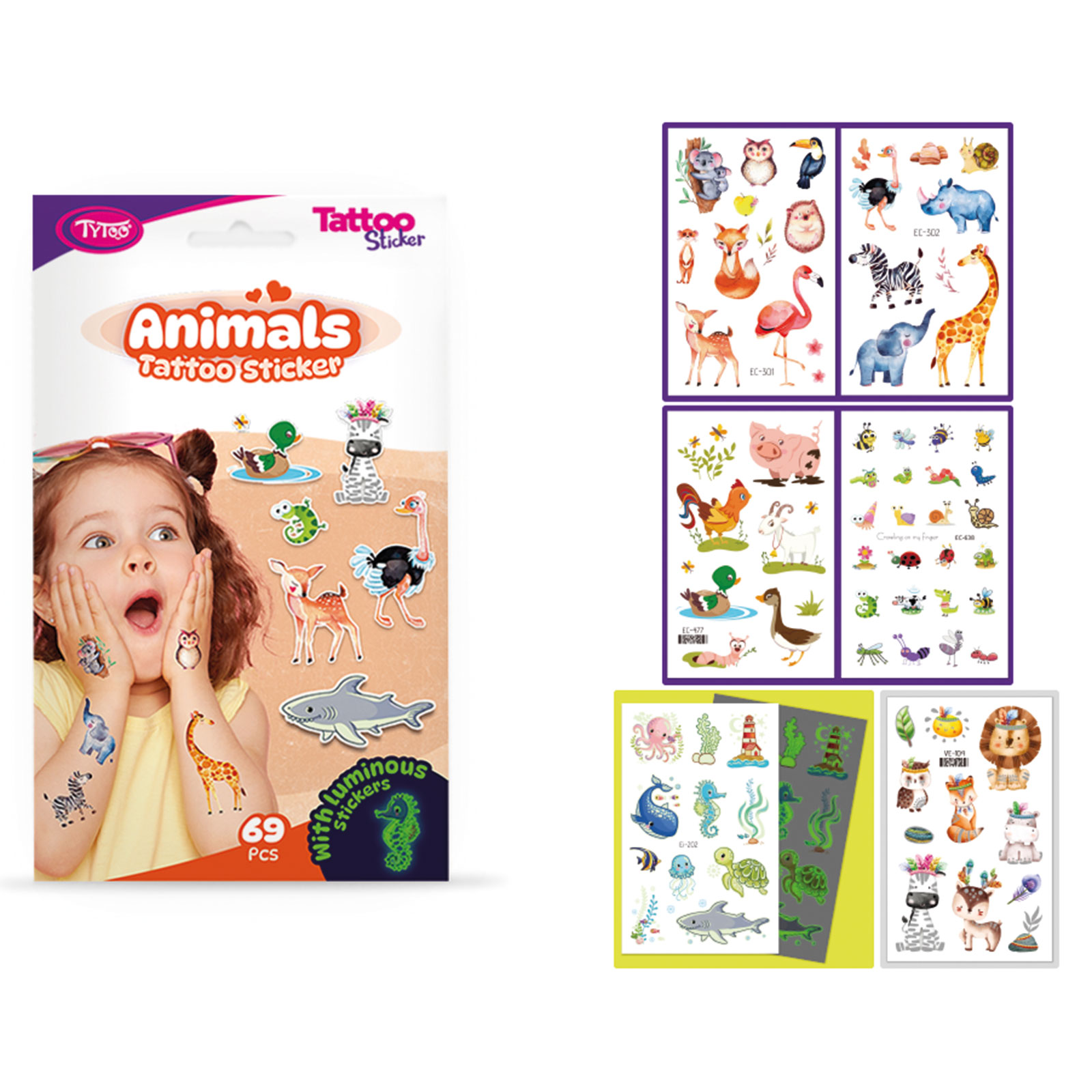 Alles wat een dier is! Gemakkelijk aan te brengen, eenvoudige en spectaculaire tattoos met dierenpatronen, in een set. Voor echte dierenliefhebbende kinderen. Deze tijdelijke tattoo stickers zijn van hoge kwaliteit, zodat ze hun levendige kleur en details lang behouden, zelfs dagenlang. Ze zijn gemakkelijk aan te brengen en te verwijderen zonder de huid te irriteren of te beschadigen. 69 dierensticker tattoos op 6 vellen: Grote dieren, kleine dieren, lichtgevende dieren, waterdieren en alles wat dierlijk is.