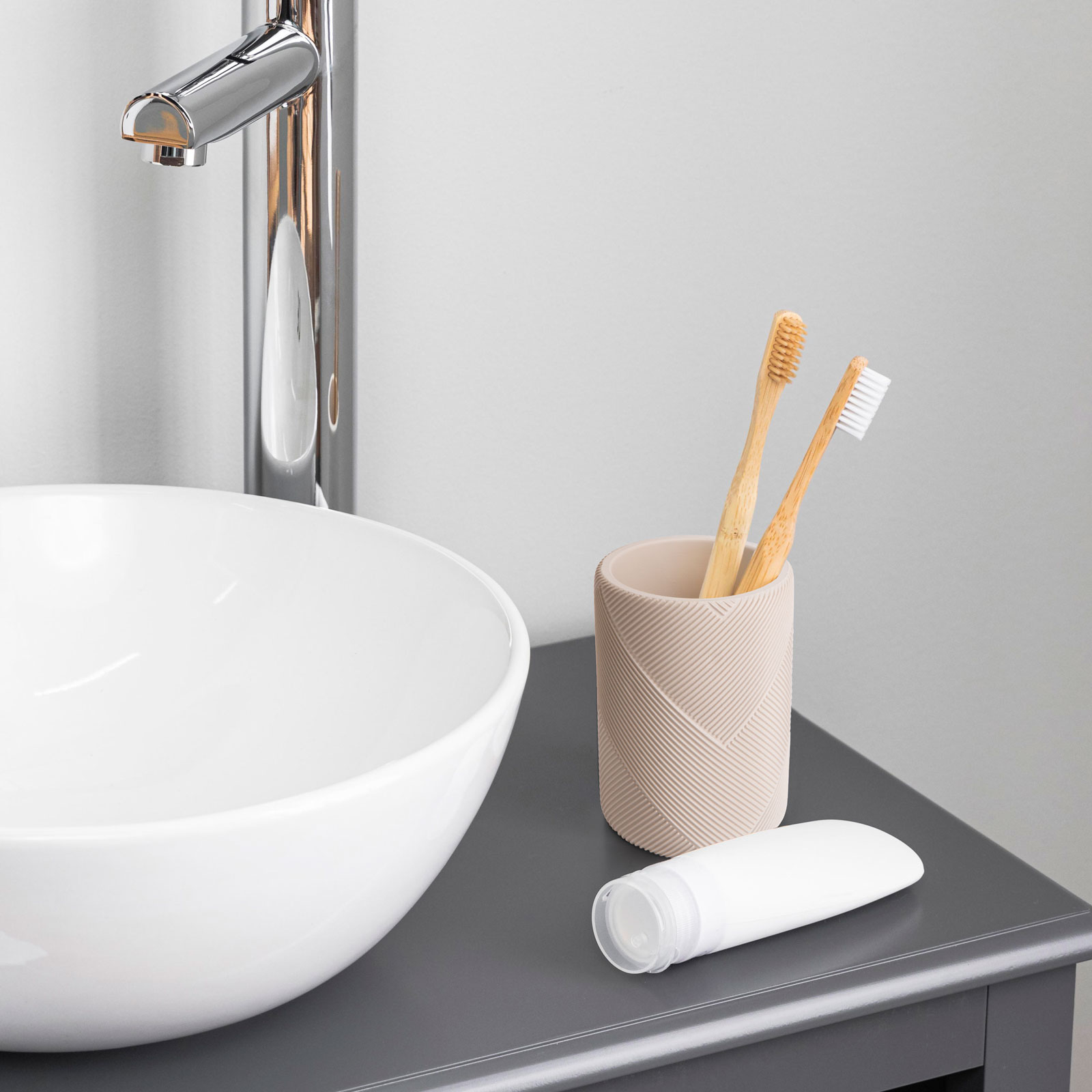 Als u op zoek bent naar strakke elegantie en modern design, dan is dit matbeige badkamerglas de perfecte keuze. Het matbeige oppervlak geeft het badkamerinterieur een moderne en elegante touch. Het glas van kunsthars zal u niet alleen betoveren met zijn uiterlijk, maar ook met zijn duurzaamheid en functionaliteit. Het materiaal is gemakkelijk schoon te maken. De compacte beker past gemakkelijk rond de wastafel of op het badkamerplankje, zodat u hem altijd bij de hand hebt wanneer u hem nodig hebt. Of het nu gaat om een tandenborstel, tandpasta of andere kleine spullen, u kunt alles stijlvol en netjes opbergen in deze badkamerbeker.