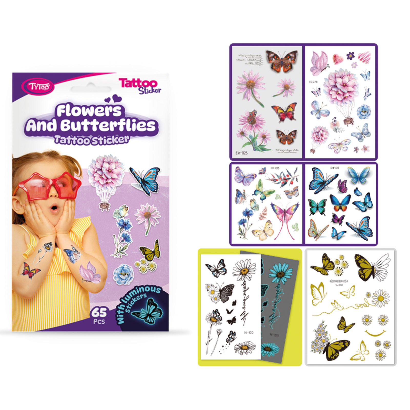 Gemakkelijk aan te brengen, eenvoudige en spectaculaire tattoos voor liefhebbers van bloemen en vlinders. Deze tijdelijke tattoo stickers zijn van hoge kwaliteit, dus ze behouden hun levendige kleur en detail voor een lange tijd, zelfs dagenlang. Ze zijn gemakkelijk aan te brengen en te verwijderen zonder de huid te irriteren of te beschadigen. De inhoud van de set: 65 bloemen- en vlinderstickerstattoos op 6 vellen, veel vlinders, bloemen, helder en kleurrijk, en zelfs een bloemenballon.