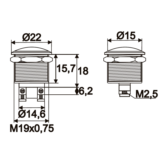 Knoptype: SPST Huidig: 2 A – 250 V AC Installatiediepte: 24,2 mm Geïnstalleerde grootte: M19 x 0,75 Aansluitmaat: 6,2 mm
