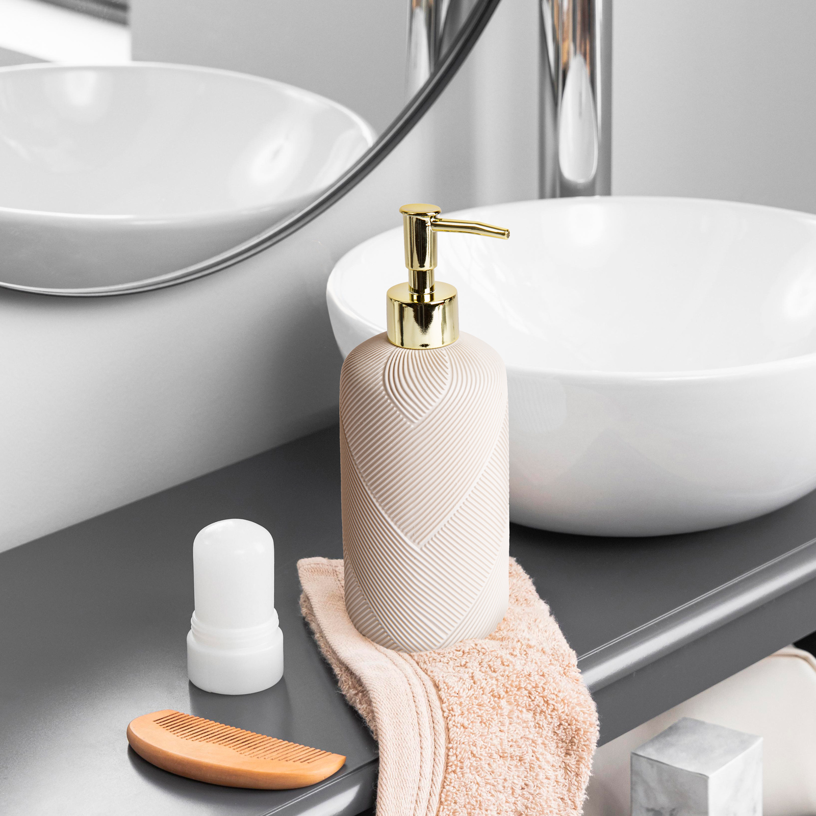 Als u op zoek bent naar elegantie en functionaliteit in uw badkamer of keuken, dan is deze handpompzeepdispenser de perfecte keuze. De harmonieuze combinatie van het matbeige gedeelte en de gouden pomp garandeert een elegante uitstraling in elke omgeving.
