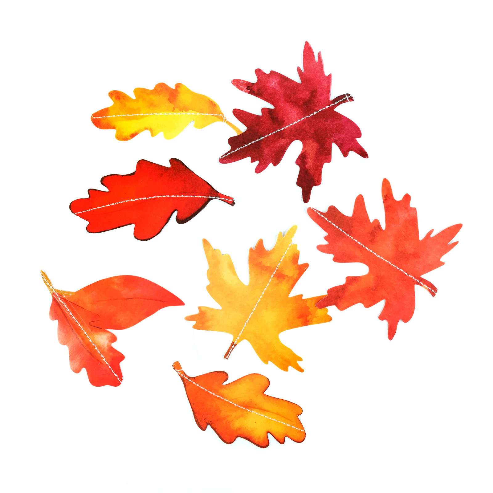 Maat: 2,1 m snaar Bladgrootte: ~13 x 13 cm Kleur: Rood, geel Aantal bladeren per streng: 7 stuks Aantal strengen: 4 stuks Materiaal: Papier Gewicht: ~40 gram
