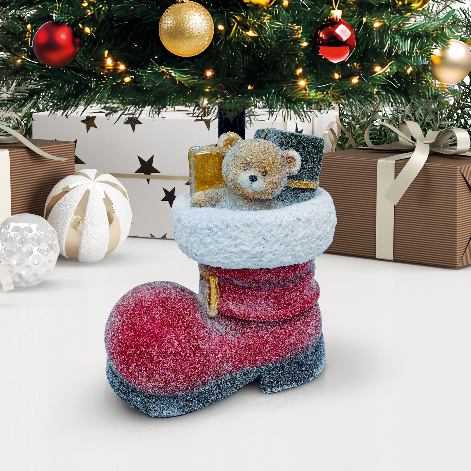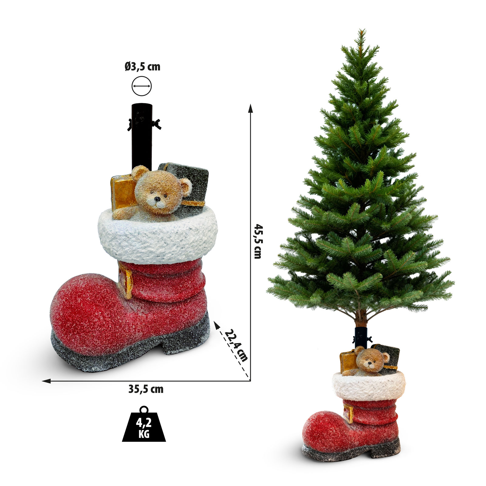 Deze kerstboomstandaard in de vorm van een kerstmanlaars is niet alleen praktisch, maar ook een decoratieve toevoeging aan uw boom. De rode laars met witte bovenkant lijkt op een echt schoenplaatje en houdt uw kerstboom stevig vast. De standaard is gemaakt van kunststeen en staat stevig, zelfs bij grotere bomen.