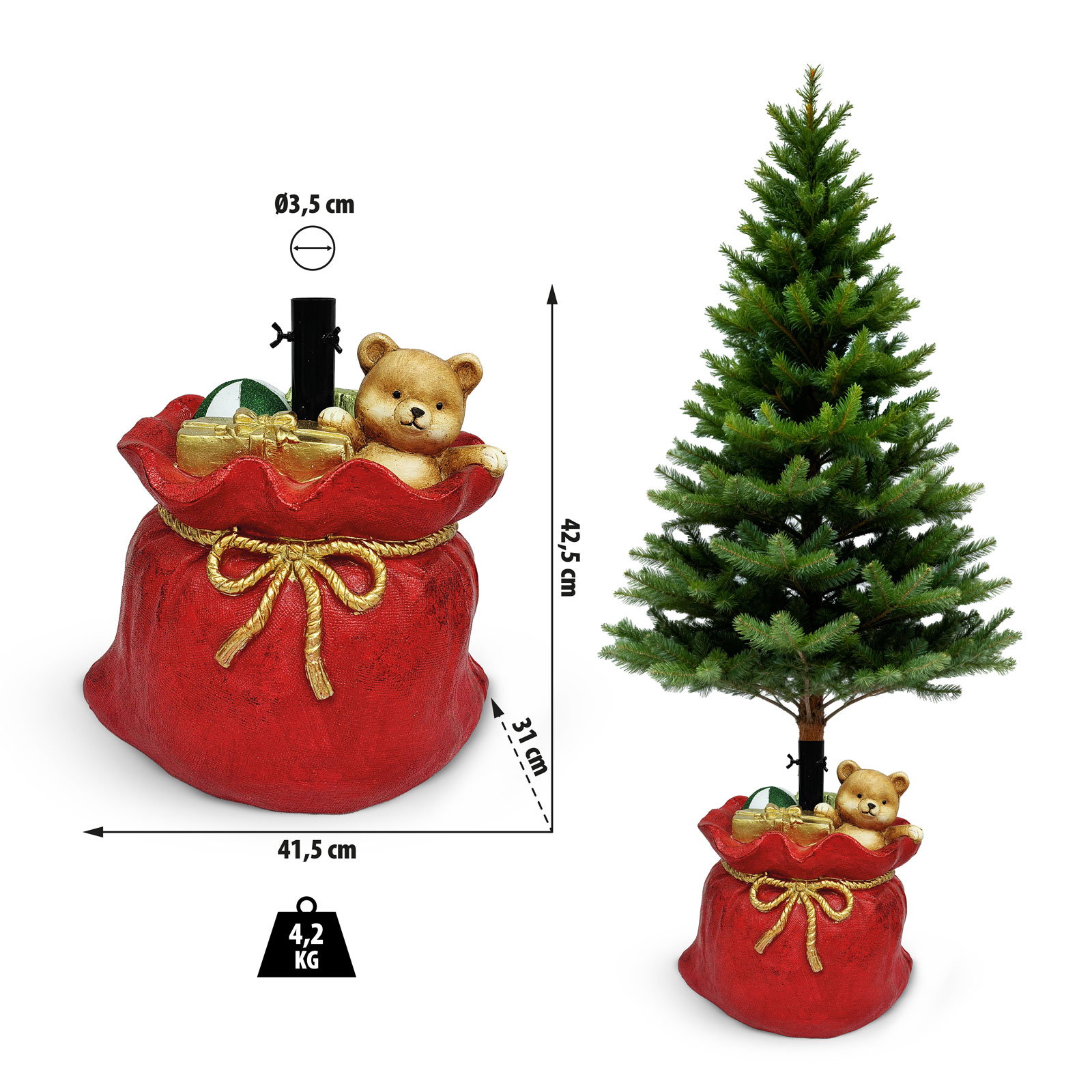 Deze kerstboomstandaard in de vorm van een kerstzak is niet alleen praktisch, maar ook een decoratief element voor de kerstboom. De rode zak, versierd met een gouden touwtje, lijkt op een levensechte kerstcadeauzak en houdt de boom stevig vast. De voet is gemaakt van kunststeen en biedt stevige ondersteuning, zelfs voor grotere bomen.