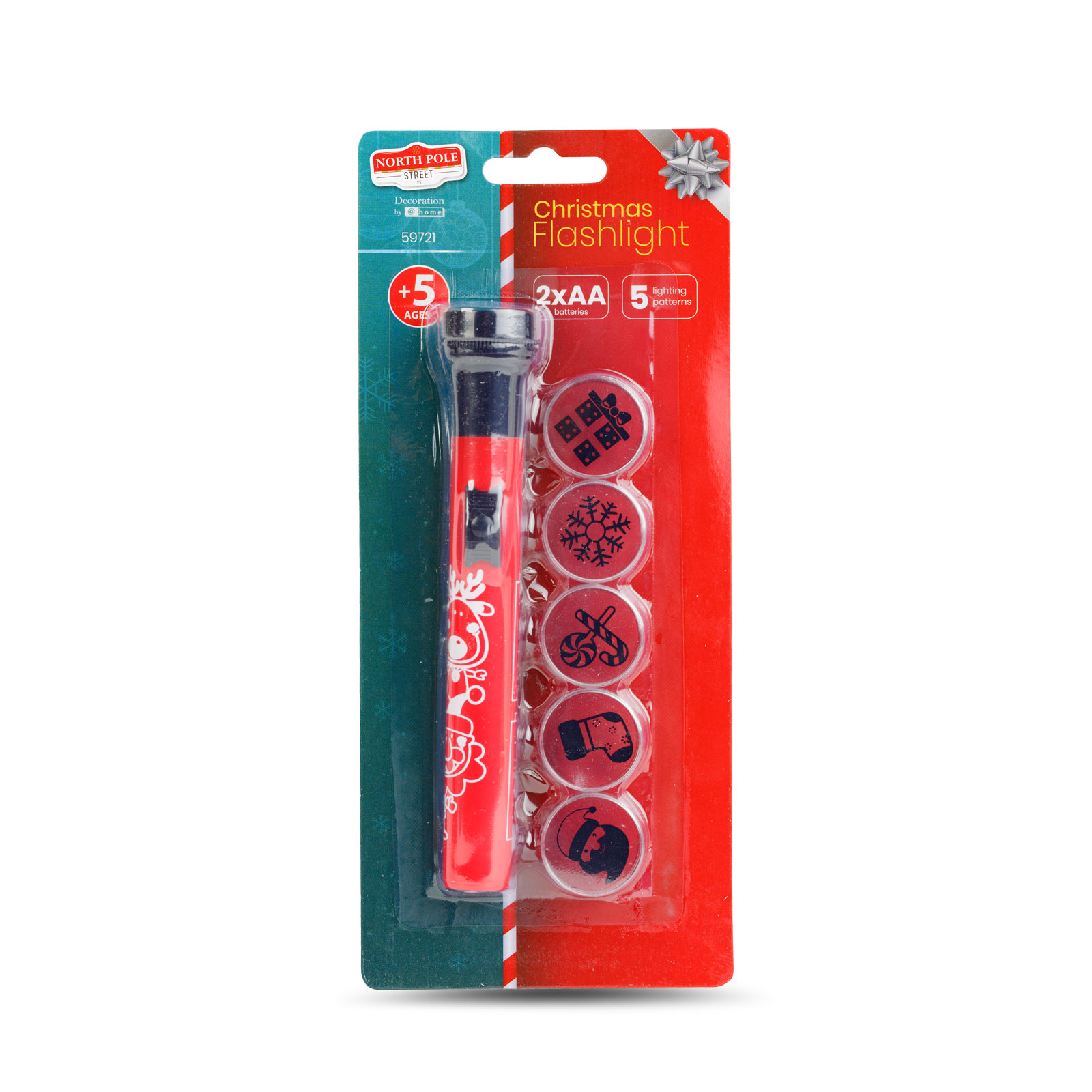 Energiebron: 2 x AA 1,5V batterijen (niet inbegrepen) Lichtbron: 1 x LED LED-kleur: Koel wit Patronen: 5 stuks – Kerstman, sneeuwvlok, kous, cadeau, lolly Maat: 260 x Ø15 mm Kleur: Rood, wit Materiaal: Plastic Gewicht: ~18 g (zonder batterijen, met 5 doppen)