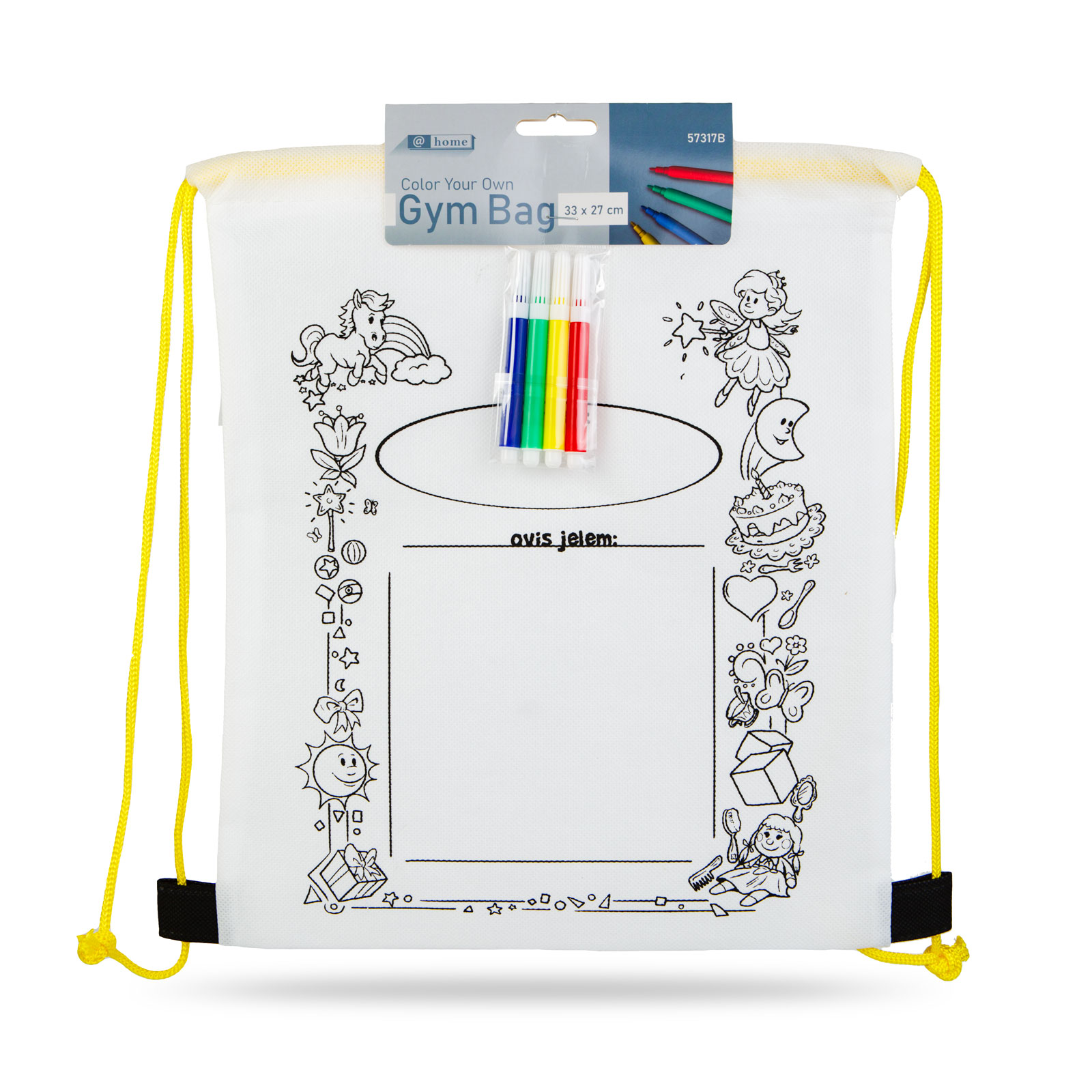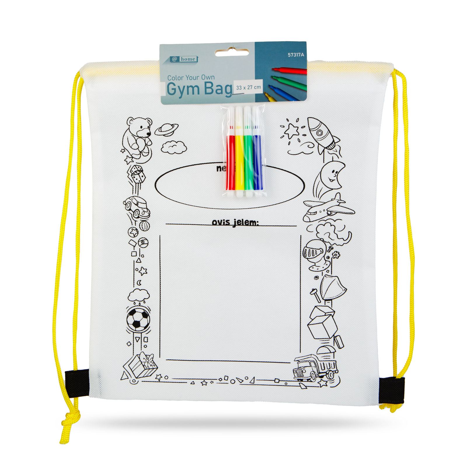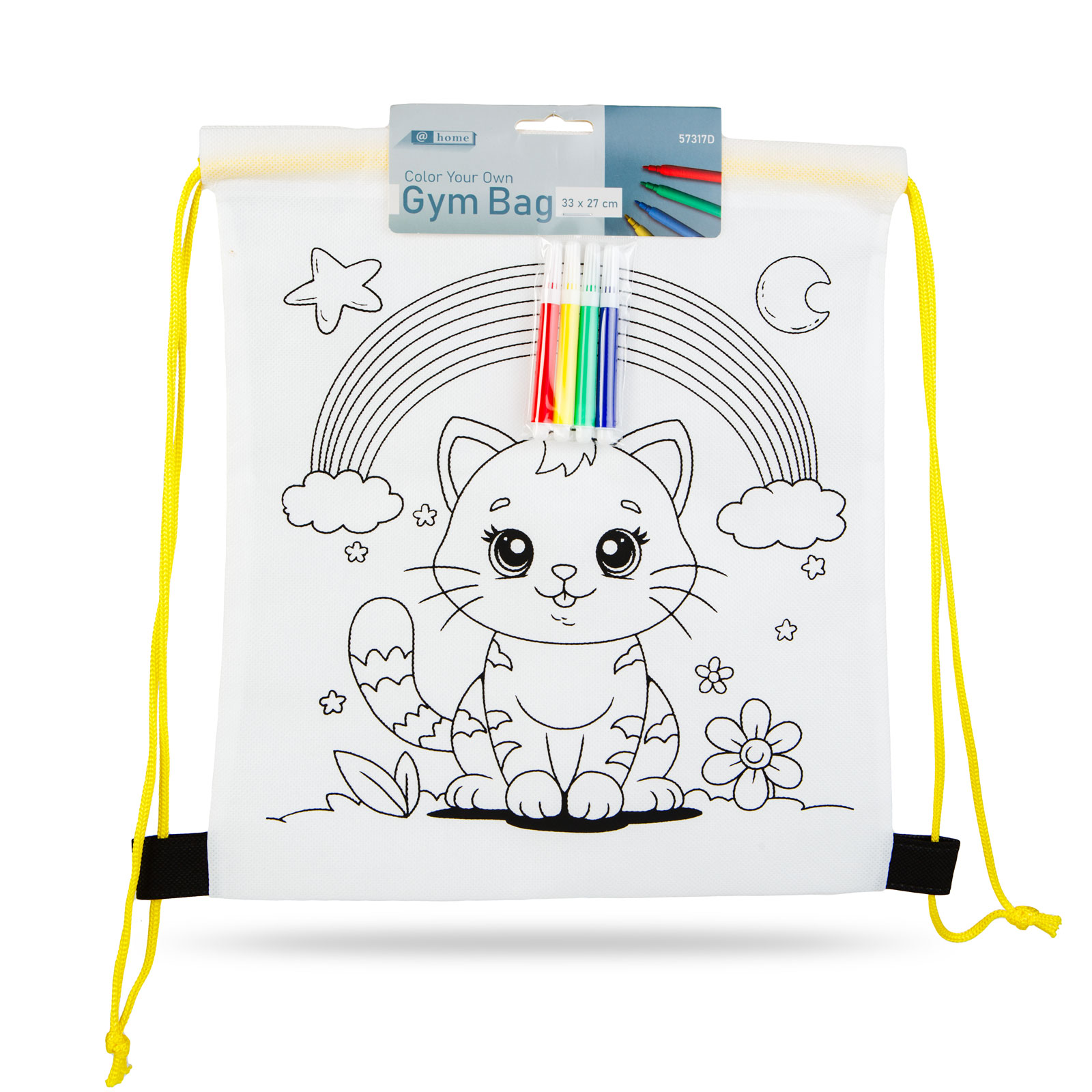 Kleur je eigen trekkoordrugzak met de meegeleverde set kleurrijke stiften! Twee in één: een rugzak én een leuke, creatieve bezigheid voor kinderen. Plaats tijdens het kleuren een dikker stuk papier tussen de stoflagen om te voorkomen dat de inkt erdoorheen sijpelt.