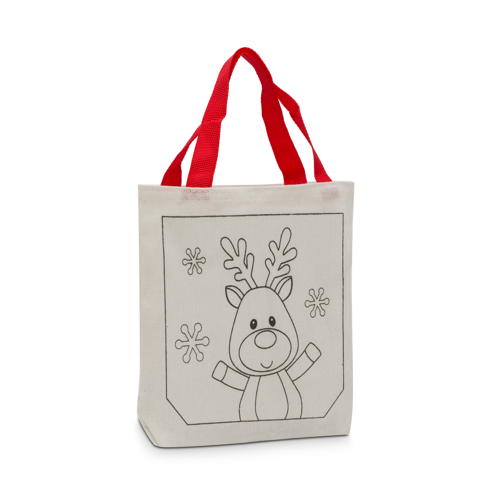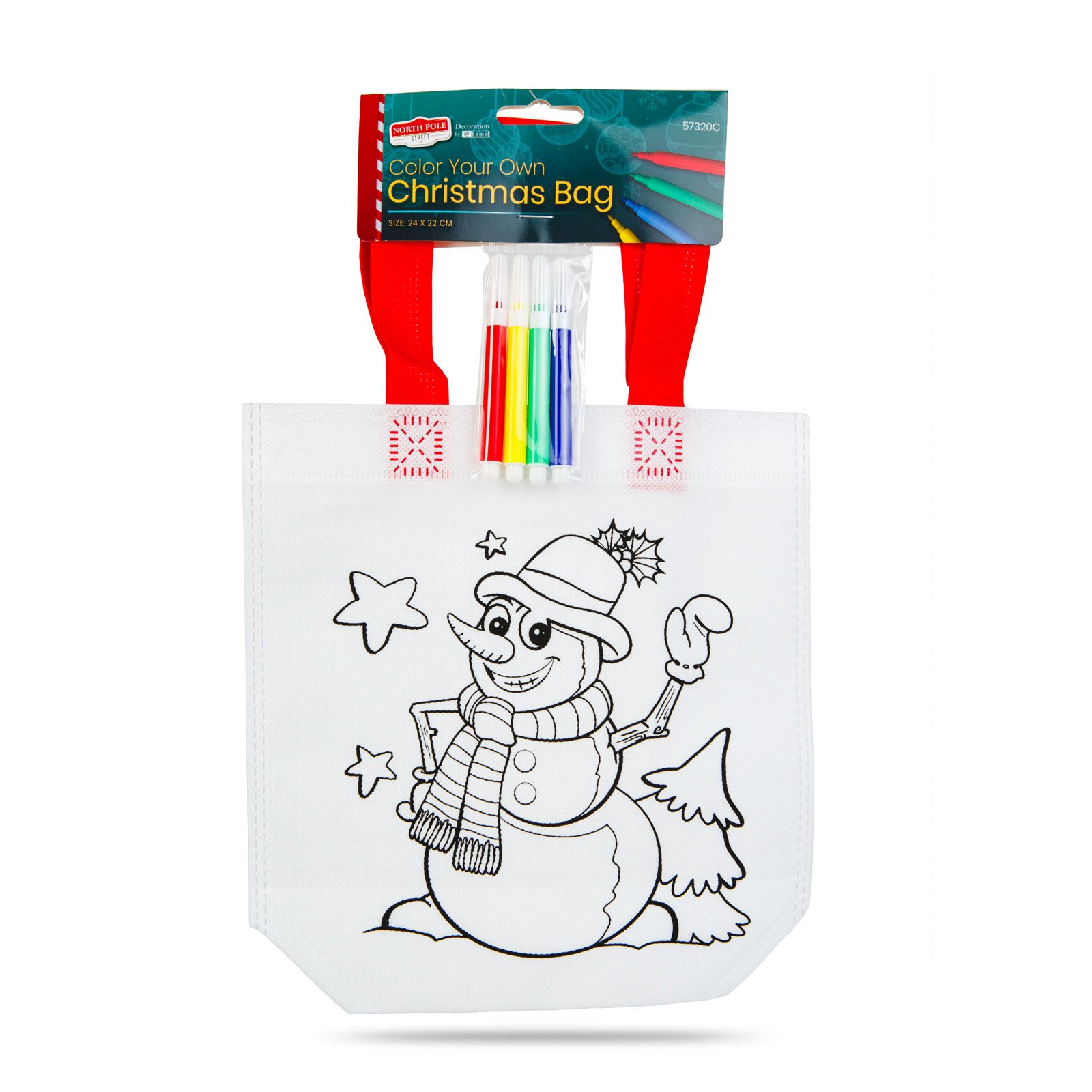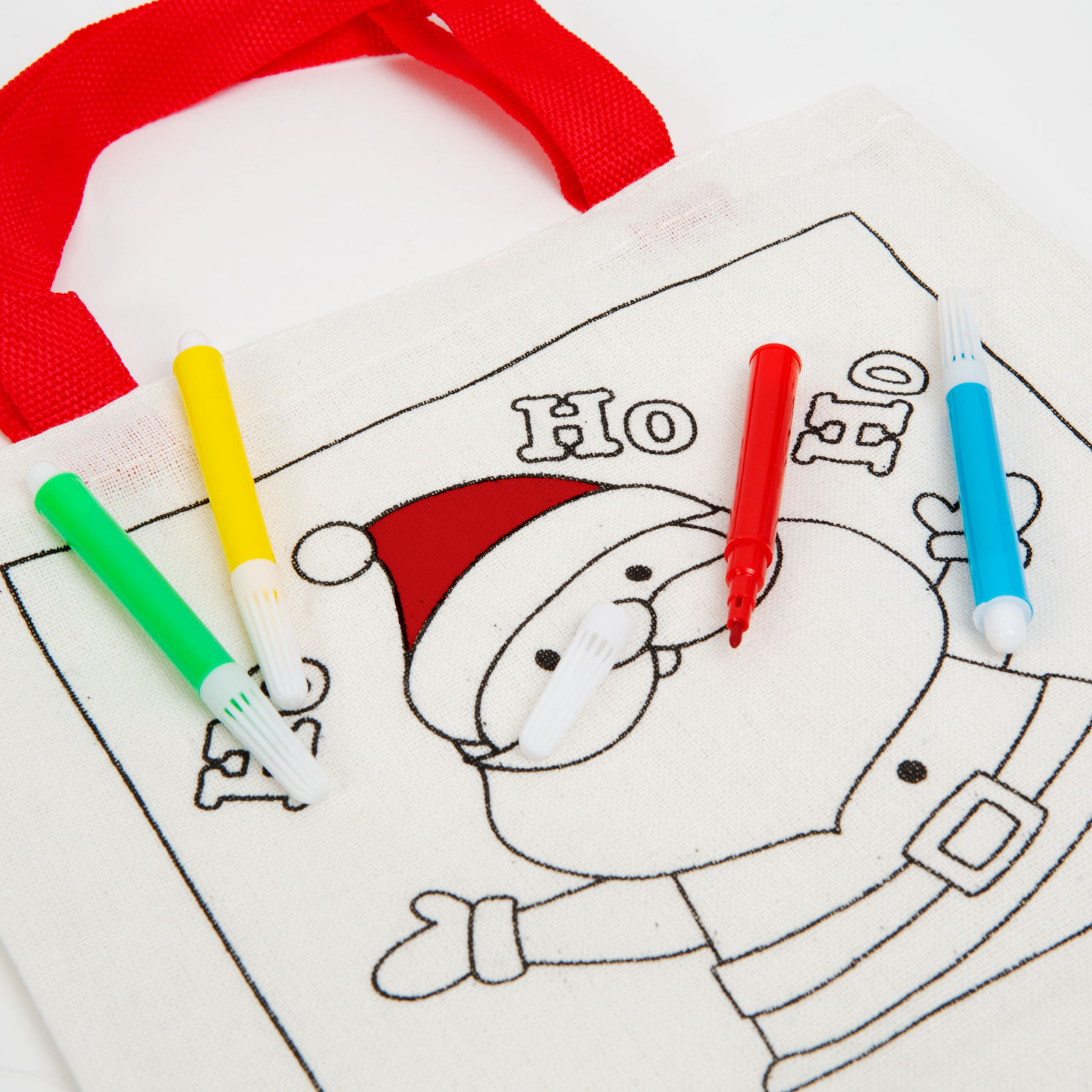 Kleur je eigen tas in met een set gekleurde stiften. Twee in één: tas én creatieve activiteit voor kinderen. Plaats tijdens het kleuren een dikker vel papier tussen de twee lagen van de tas om te voorkomen dat de inkt doorlekt naar de achterkant.