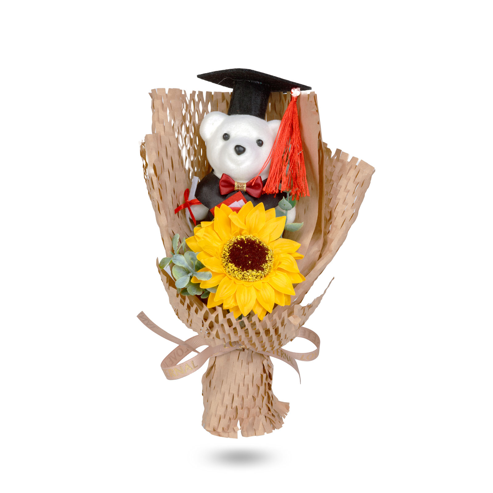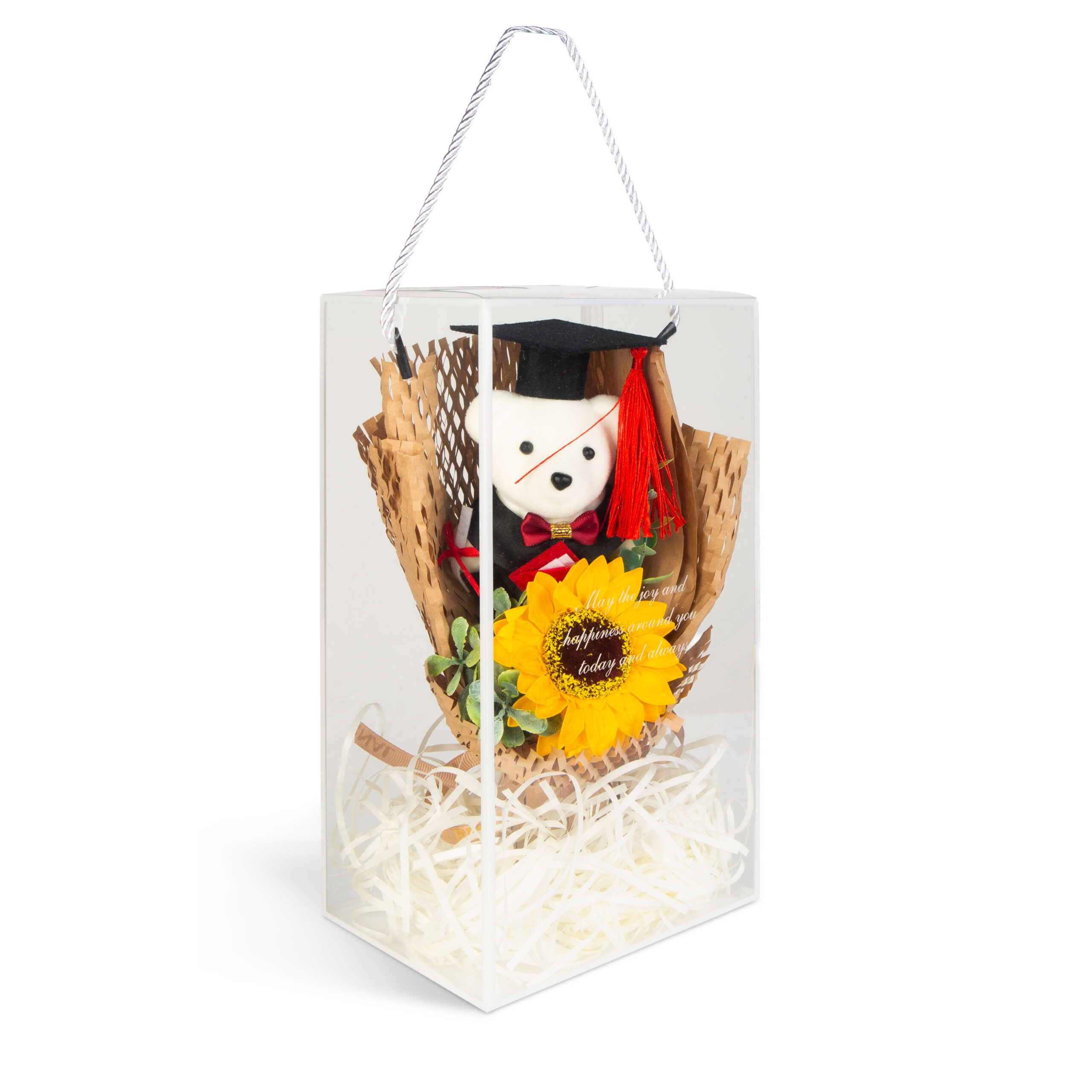 Een unieke decoratie die direct klaar is om cadeau te geven, waardoor het de perfecte keuze is voor afstuderen, diploma-uitreikingen of andere feestelijke gelegenheden. De compositie, verpakt in een transparante geschenkdoos, bevat een schattige “afstudeer”-teddybeer, een levensechte zonnebloem en smaakvolle decoratieve elementen, waardoor inpakken niet nodig is. De harmonieuze details en het zorgvuldige vakmanschap maken het tot een echt opvallend cadeau.