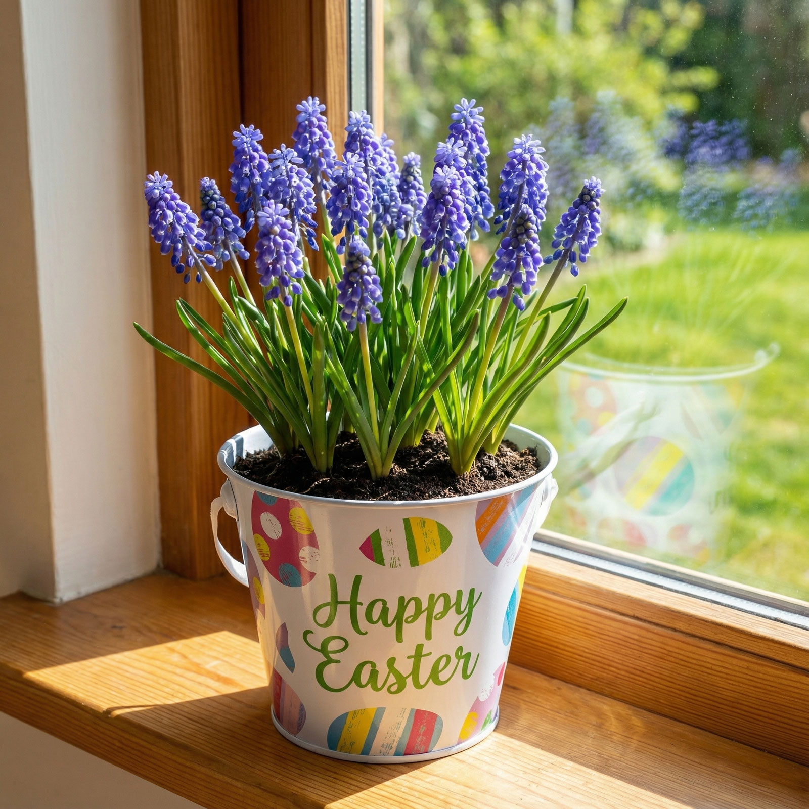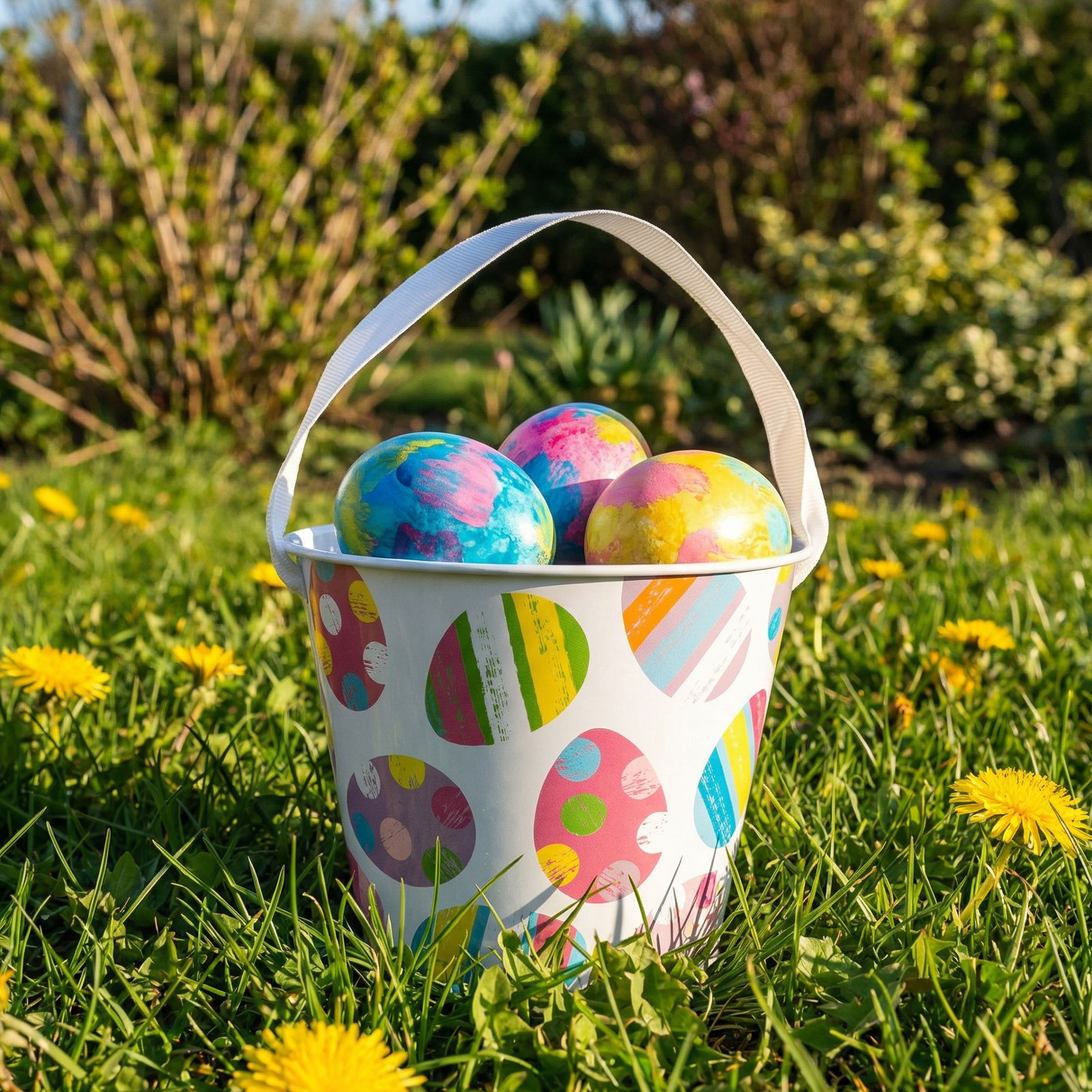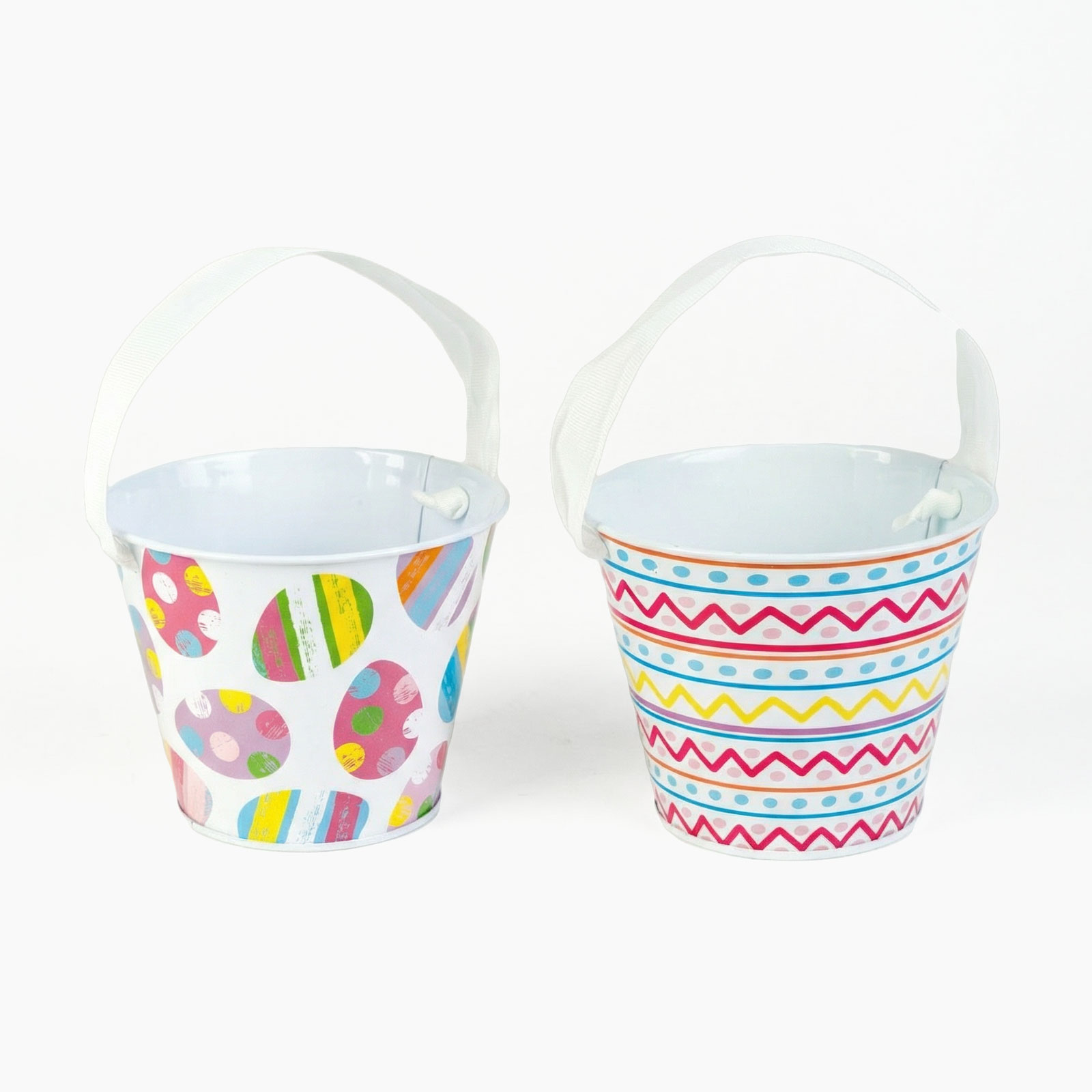 Fleur je paasdecoratie op met deze vrolijke metalen emmer met patroon! De emmer heeft een lintvormig handvat dat niet alleen praktisch is, maar ook een mooie toevoeging aan de feestelijke sfeer. Verkrijgbaar in twee uitvoeringen: een met kleurrijke eierpatronen en een met geometrische paasmotieven. Ideaal voor het bewaren van kleine cadeautjes, snoepjes of eieren, en perfect als onderdeel van een tafel- of decoratiearrangement.