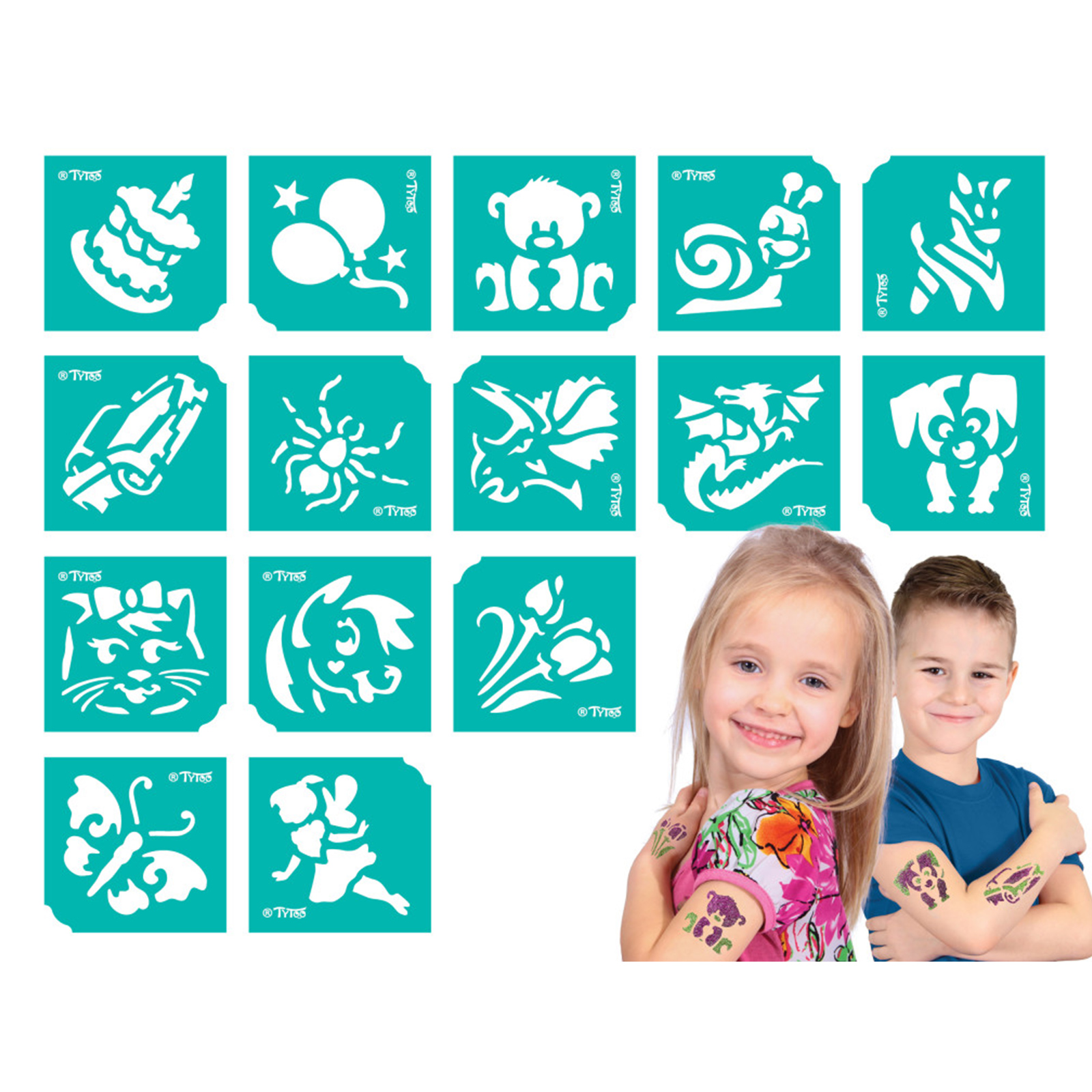 De sjablonenset bevat 15 verjaardagsontwerpen voor kinderen, die je kunt gebruiken voor glittertattoos of andere lichaamsbeschilderingen. Je krijgt prachtige ontwerpen in één pakket, zoals katjes, teddyberen, honden, slakken of draken, die kinderen zeker zullen waarderen.