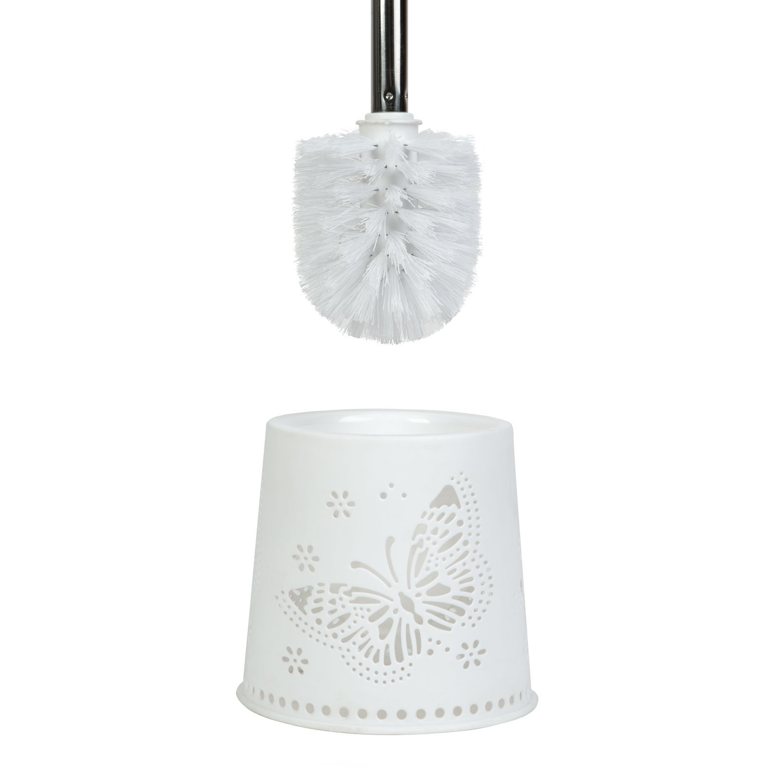Praktische toiletborstelset met houder in mat wit, versierd met een vlinder aan de zijkant. De houder zorgt voor stabiliteit en duurzaamheid van de borstel. De borstel heeft een glanzend zilveren handvat dat gemakkelijk te gebruiken is en een comfortabele grip biedt. De toiletborstel draagt effectief bij aan een goede hygiëne, terwijl de houder zorgt voor een veilige opslag van de borstel.