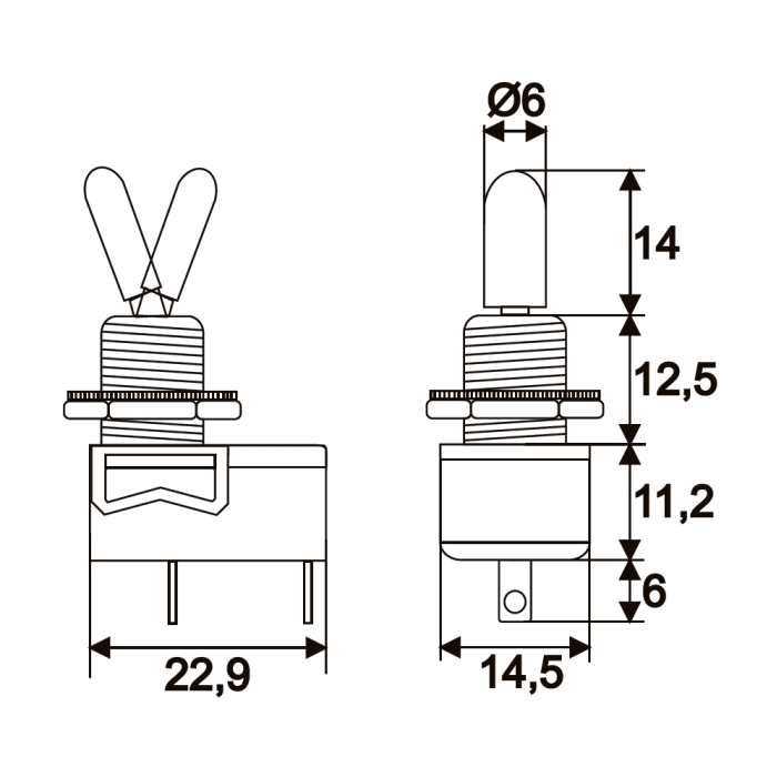 Schakelaartype: SPST Huidig: 3 A (6 A) – 250 V AC Inbouwdiepte: 17,2 mm Schakelbreedte: 14,5 mm Schakellengte: 22,9 mm Lengte wisselen: 14 mm Diameter van de tuimelschakelaar: 6 mm Verbinding: 2x soldeeraansluitingen