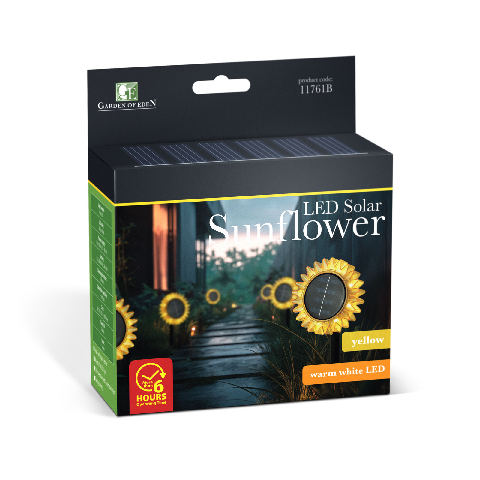 Kleur: Geel Aantal LED’s: 1 LED LED-kleur: Warm wit Zonnepaneel: 2V, 80 mA Stroombron: 1 x AA 1,2V batterij Batterijcapaciteit: 200 mAh Totale afmetingen: 13 × 6,5 × 23,5 (+11,5) cm Paallengte: 115 mm Oplaadtijd: 6 uur Bedrijfstijd: 6 – 8 uur Materiaal: Plastic Bescherming: IP44 Gewicht: ~153 g