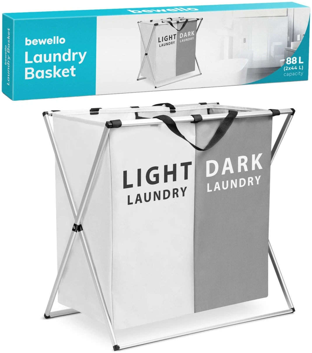 Modern ogende stoffen wasmand met meerdere vakken. Dankzij het robuuste metalen frame en de hoge capaciteit kan er tot enkele kilo’s kleding en beddengoed in worden opgeborgen. Met de compartimenten kun je kleding van verschillende kleuren scheiden. In één beweging opvouwbaar! De handvaten zorgen dat de wasmand makkelijk hanteerbaar is.