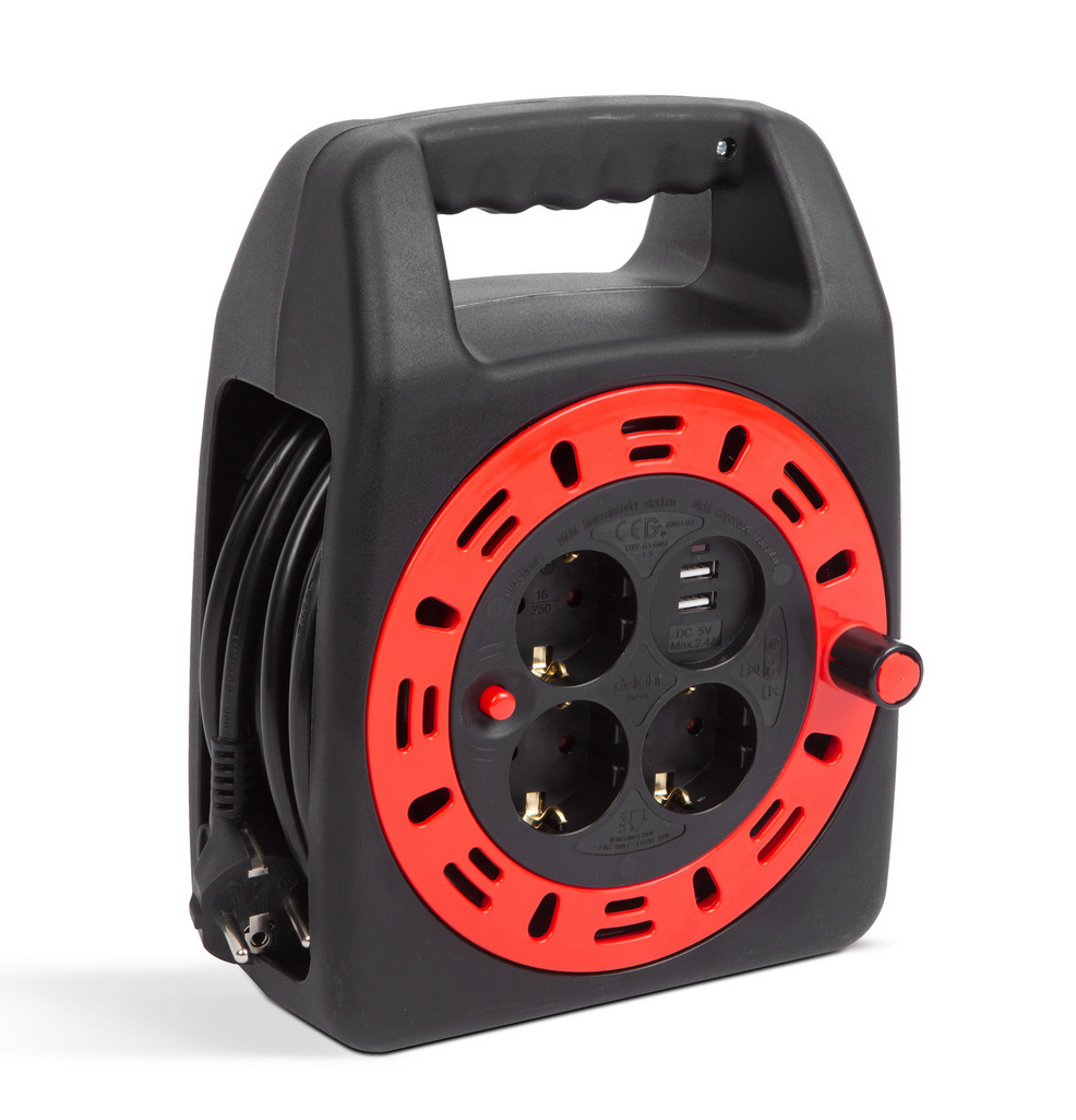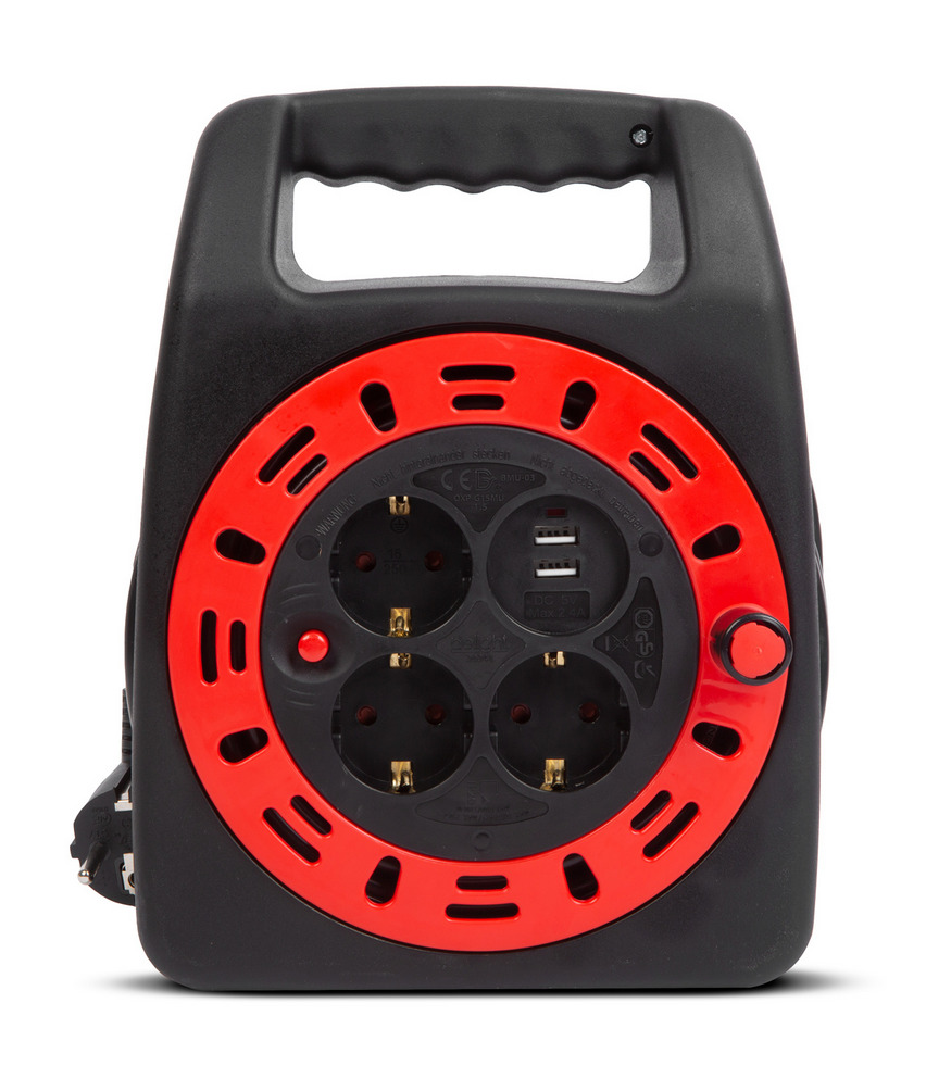 Een compacte kabelhaspel geschikt voor het ruimtebesparend opbergen van de 15 meter verlengkabel. Alle drie de 250V-stopcontacten zijn voorzien van een kinderbeveiliging, waardoor ongelukken met kinderen worden vermeden. Met behulp van de 2 ingebouwde USB-poorten kunt u uw mobiele apparaten zonder adapter opladen. Tevens is het apparaat voorzien van een thermische beveiliging, zodat bij opgerold gebruik voorkomen kan worden dat het apparaat te veel opwarmt en aan overbelasting wordt blootgesteld. Indien u daartoe de mogelijkheid heeft, gebruik dan toch ondanks de thermische beveiliging de haspel niet met een opgerolde kabel!