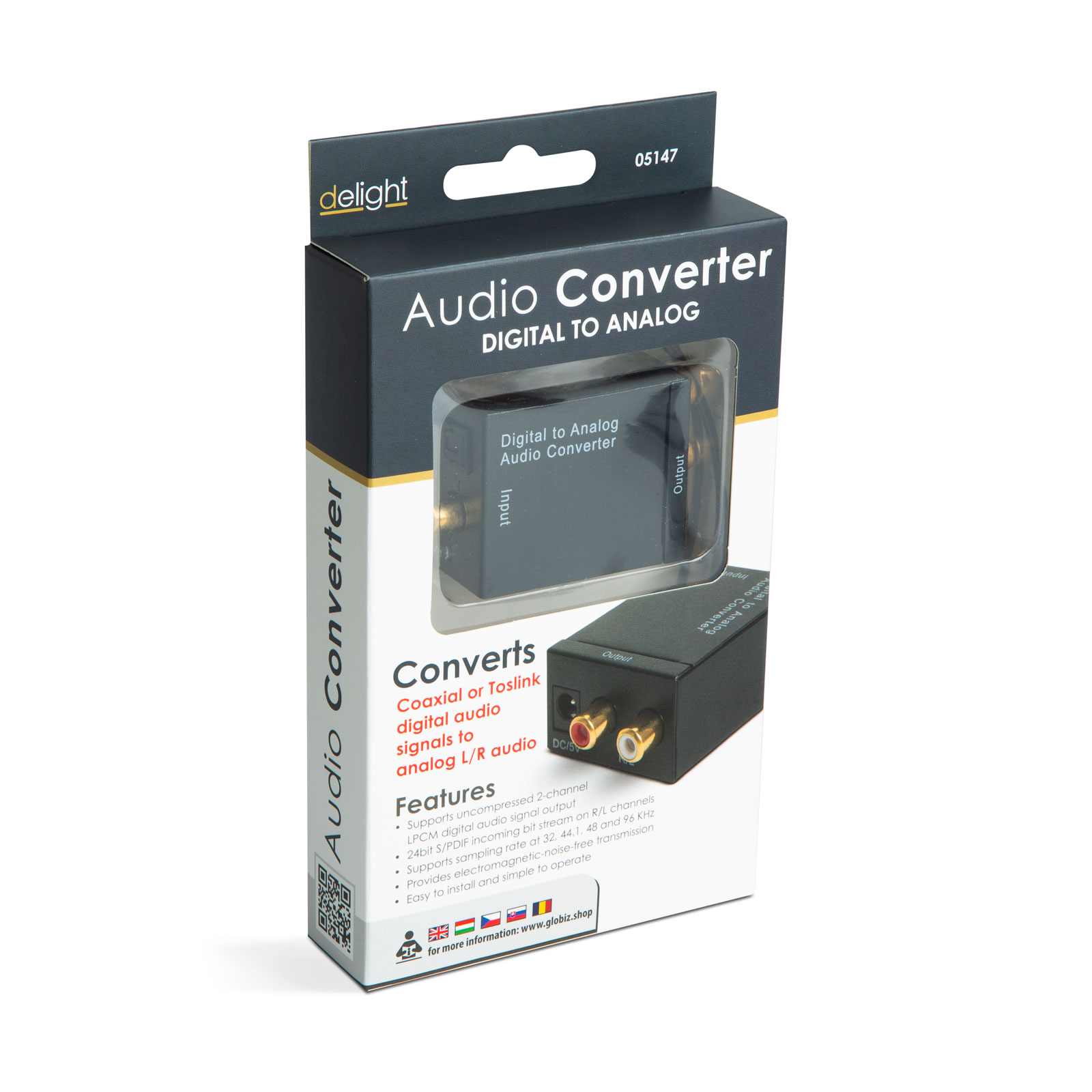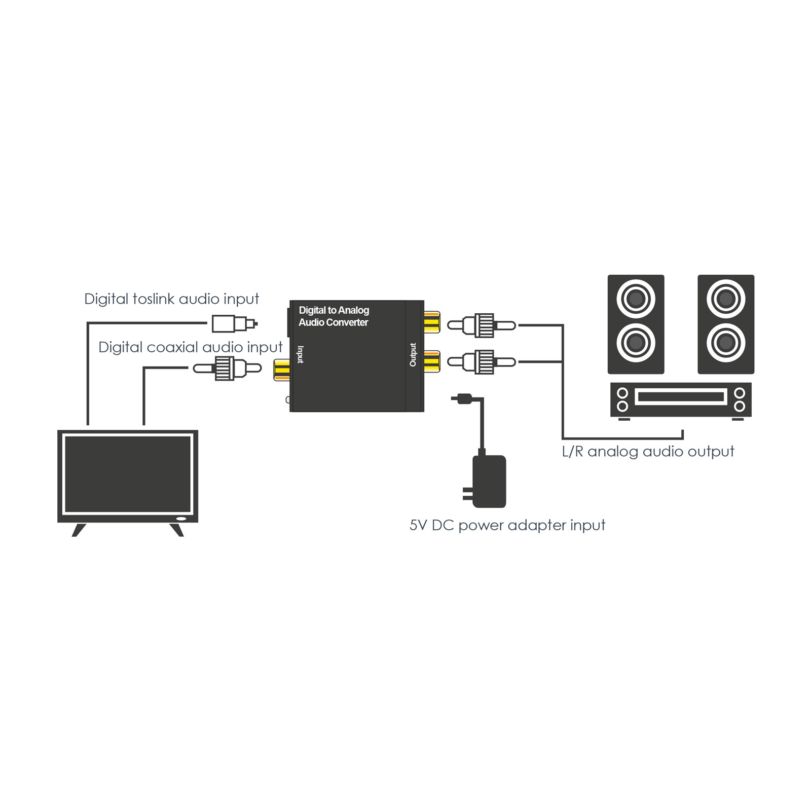 Digitale audio-naar-analoog converter die een TOSLINK/S/PDIF of coaxiaal digitaal audiosignaal kan omzetten naar een analoog stereosignaal. Dit maakt het mogelijk om versterkers, mixers of receivers aan te sluiten die niet over voldoende vrije ingangen beschikken of geen digitale signaalaansluiting accepteren. De adapter heeft een externe voeding nodig voor gebruik, die wordt geleverd door de meegeleverde USB-kabel. Indien nodig kunt u ook een 5V-oplaadkop voor USB gebruiken, maar deze kan worden aangesloten op elke USB-aansluiting met minimaal 500 mA (computer, laptop, tv, versterker…).