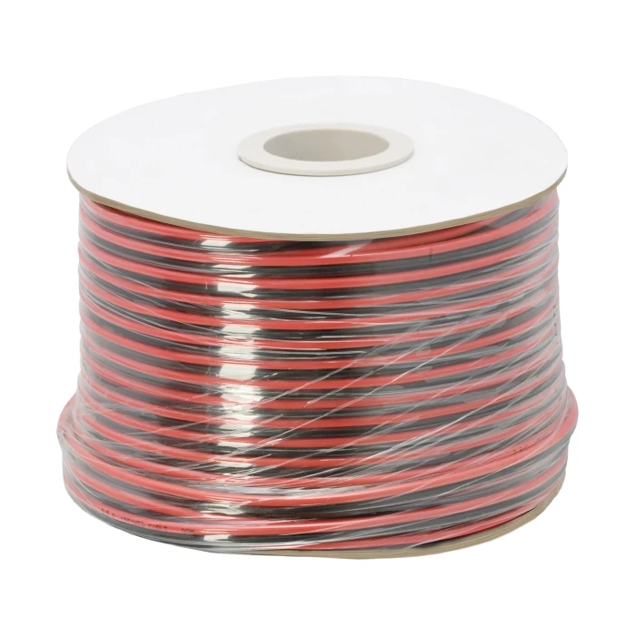 Luidsprekerkabel – 2×1,50 mm² – 100% Zuurstofvrij Koper (OFC) – Getwiste Aders – Rood/Zwart PVC Mantel – Buitenafmeting 6,3 × 3,0 mm – 100 m Papierrol – Voor Hoge Vermogensoverdracht & Optimale Geluidsweergave [20085]