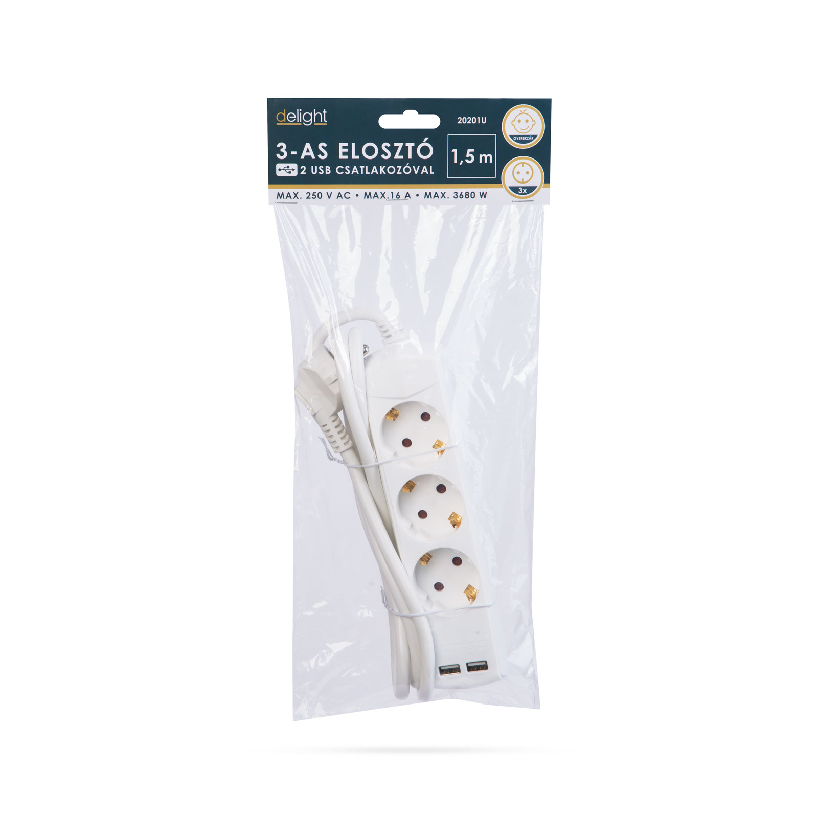 Afbeelding van Stekkerdoos 3-voudig - 1,5 m - 2x USB (2,1A) - Kinderbeveiliging - 250V • 16A - Wit [20201U] - 4e30 205d