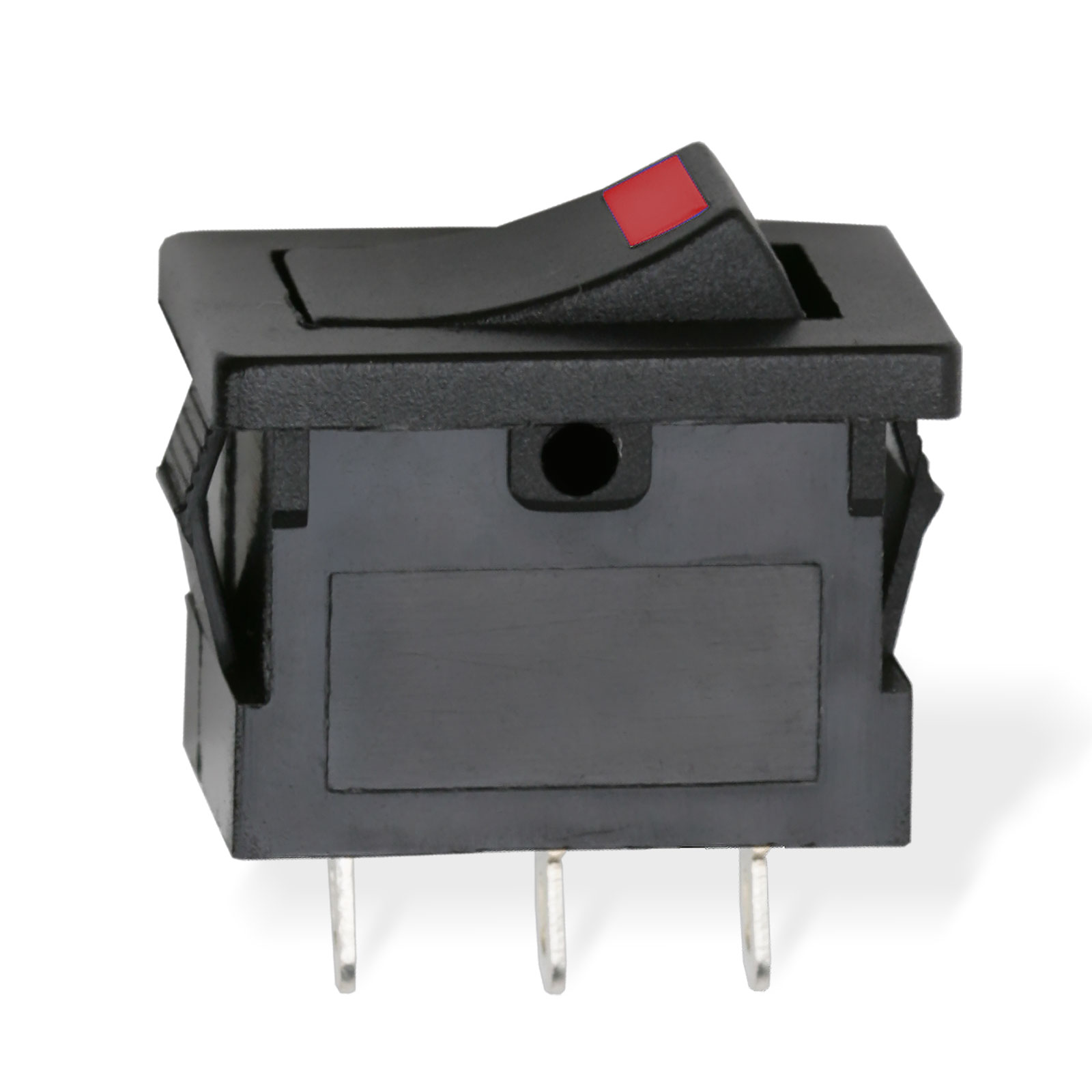 Zwarte wipschakelaar met rode led-indicator die aangeeft wanneer de schakelaar aan staat. Veelgebruikt in elektrische apparatuur en voertuigen.