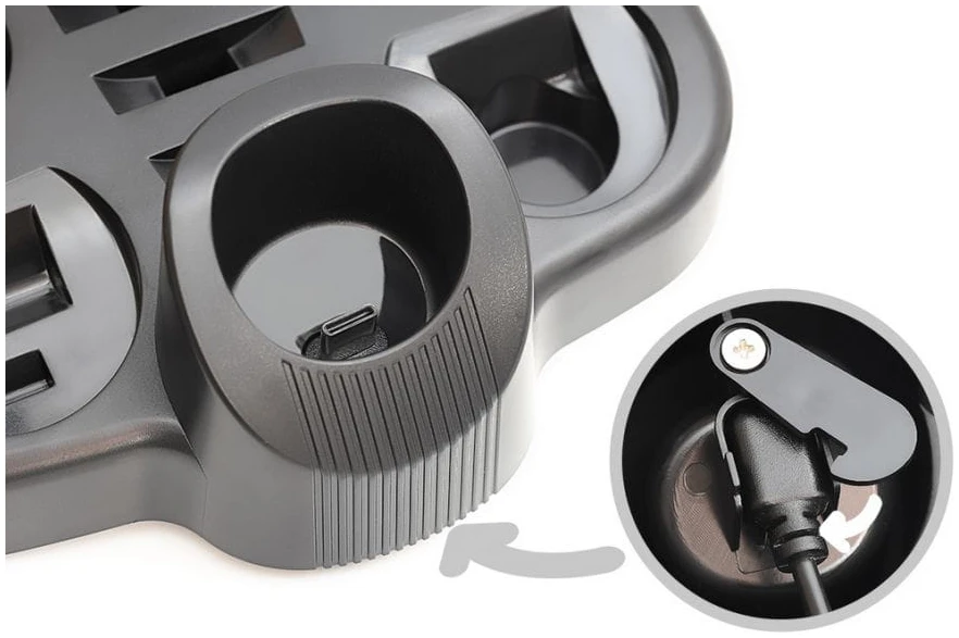 Handige basis met oplaadaansluiting en ruimte voor het opbergen van accessoires.