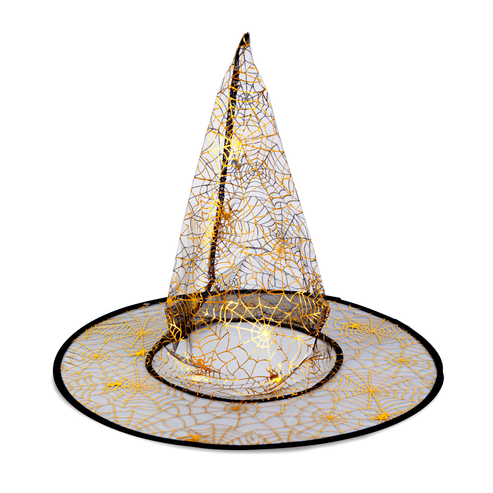 Een heksenhoed in vier kleuren met rand, een uitstekende accessoire voor een Halloweenkostuum. De buitenkant van de hoed is versierd met gouden glitterende Halloween-ontwerpen.