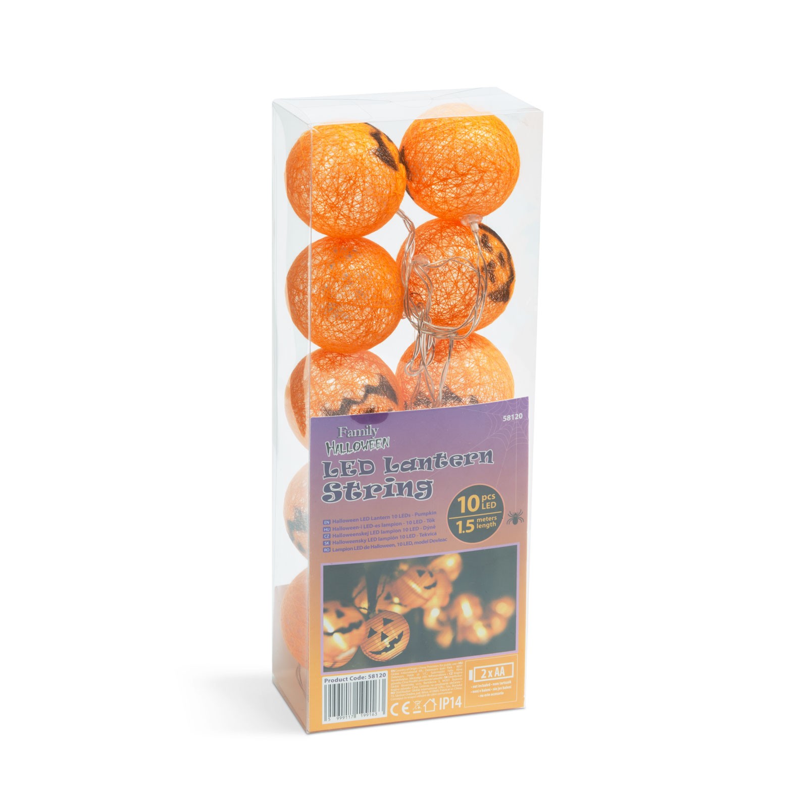 Maat: 1,5 m strook Patroon: Pompoen Grootte van de pompoen: 72 x 70 mm Voeding: 2 x AA-batterij (niet inbegrepen) Lichtbron: 10 stuks warmwitte LED’s Kleur: Oranje