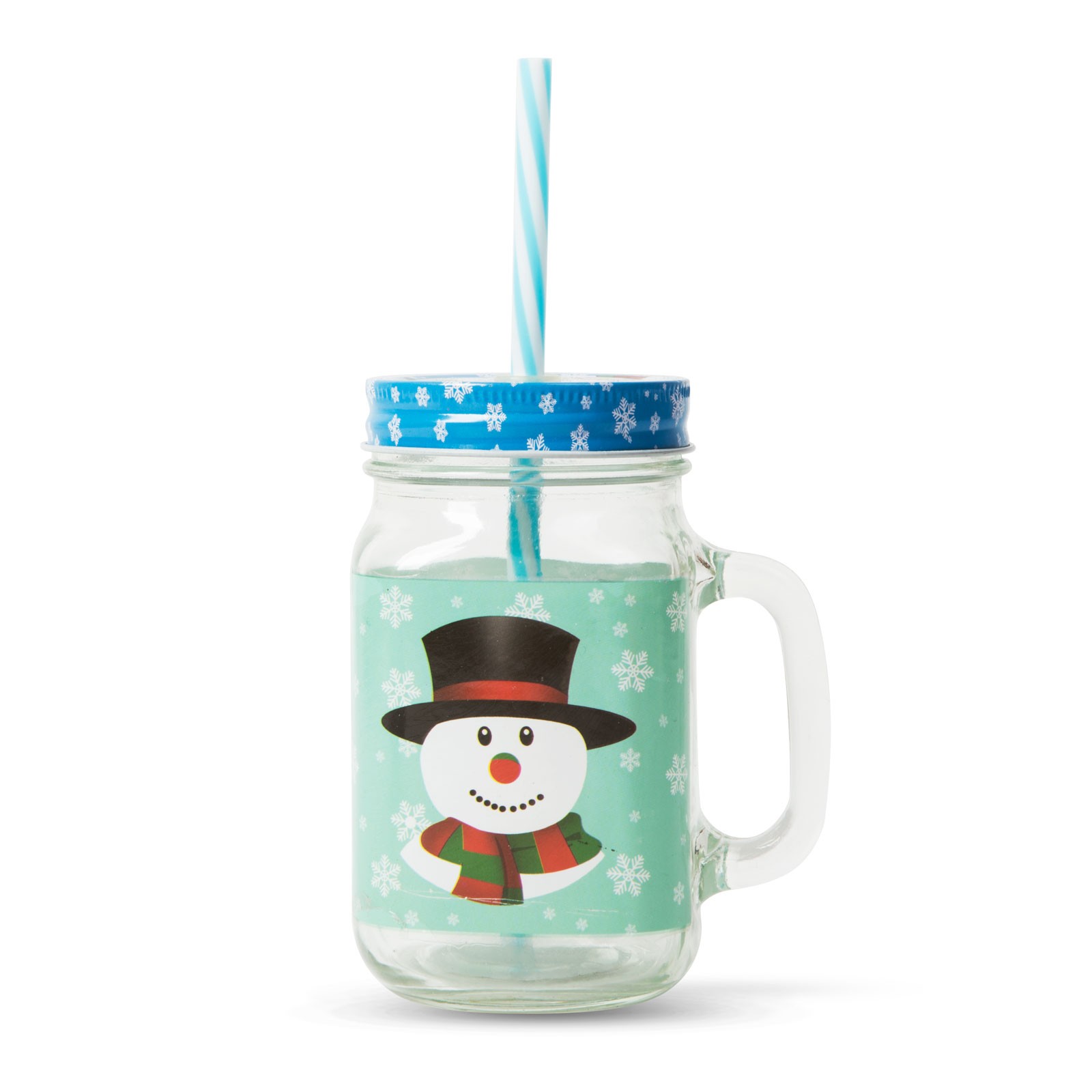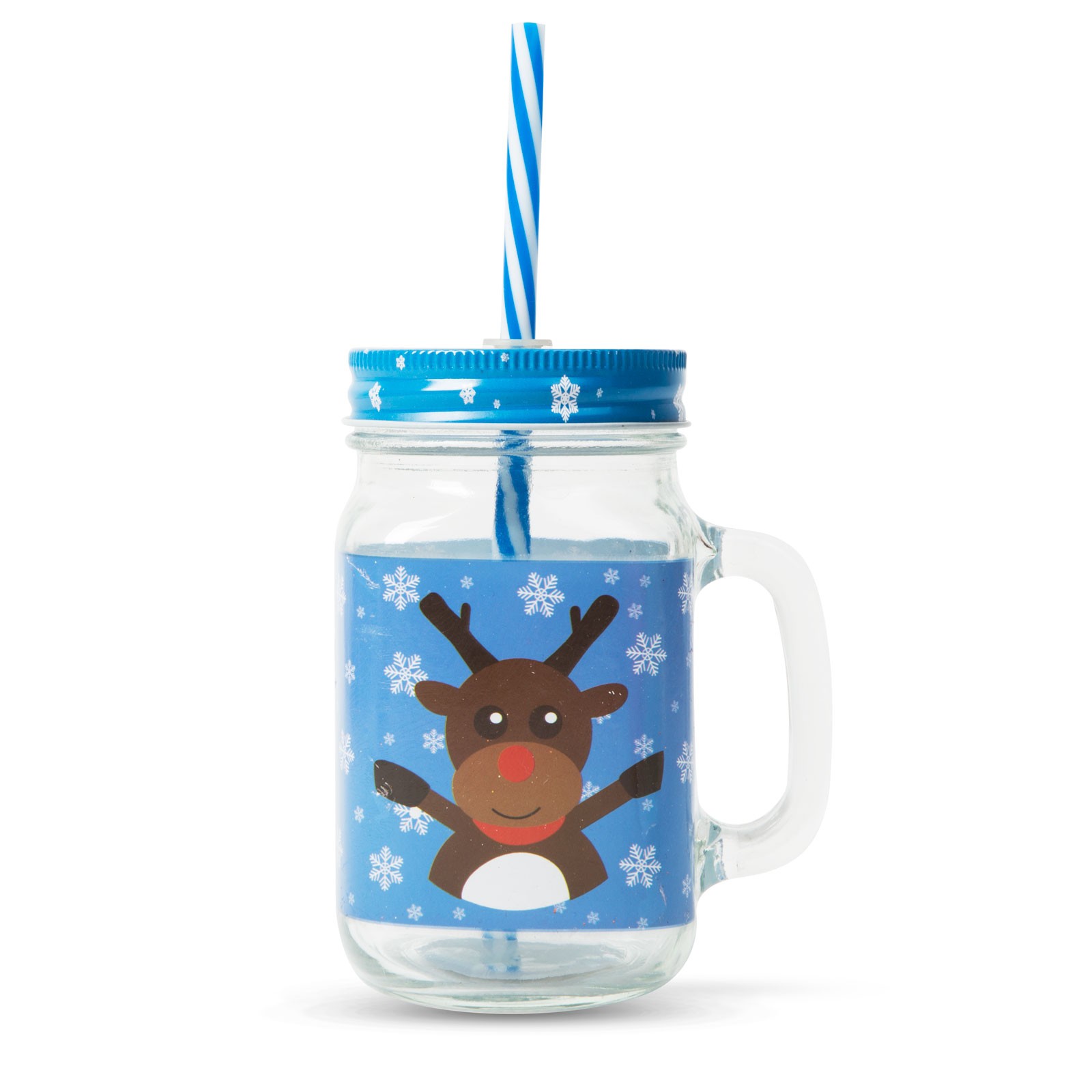 Glazen kannen met vrolijke kerstpatronen: Kerstman, sneeuwpop, rendier, verschillende kleuren, met metalen doppen.