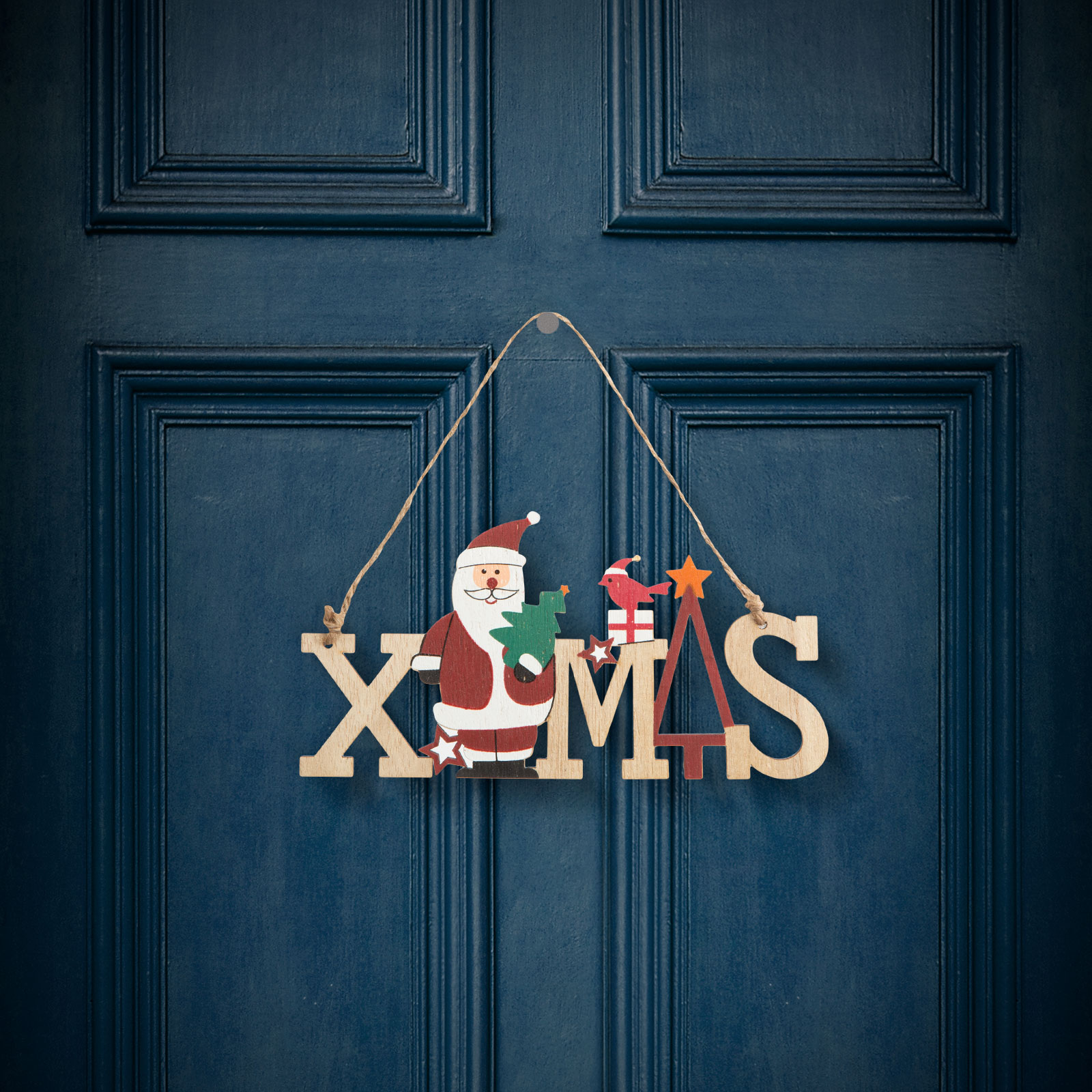Houten kerstversiering met de inscriptie “XMAS” en een schattig kerstfiguurtje. Dankzij de touwtjeshanger kan hij zelfs dienen als deurdecoratie, maar je kunt hem in elke kamer van je huis plaatsen.