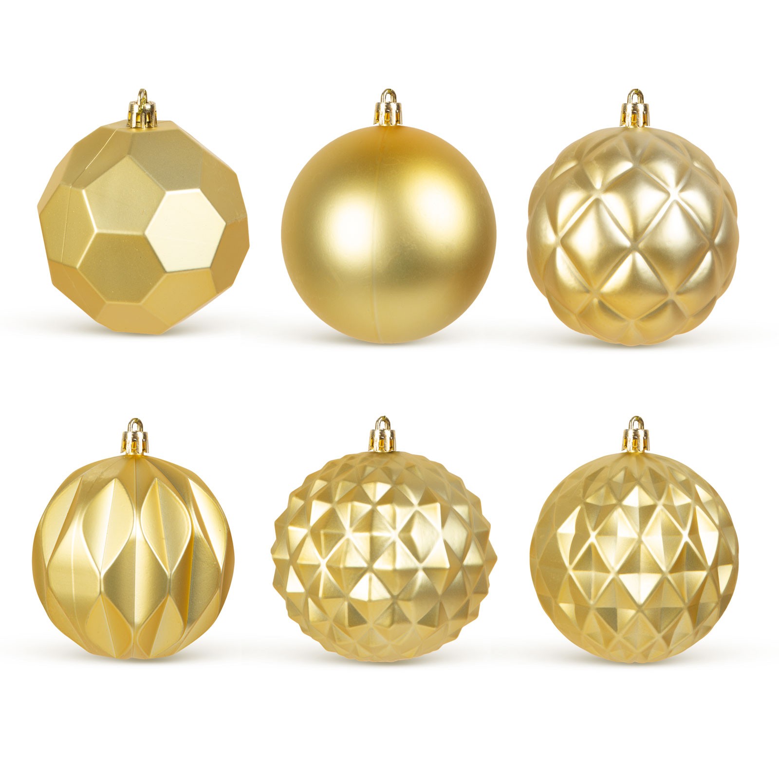 Kerstboomversiering in mat goud voor een elegante uitstraling. 6 bijzondere, unieke vormen in één set.
