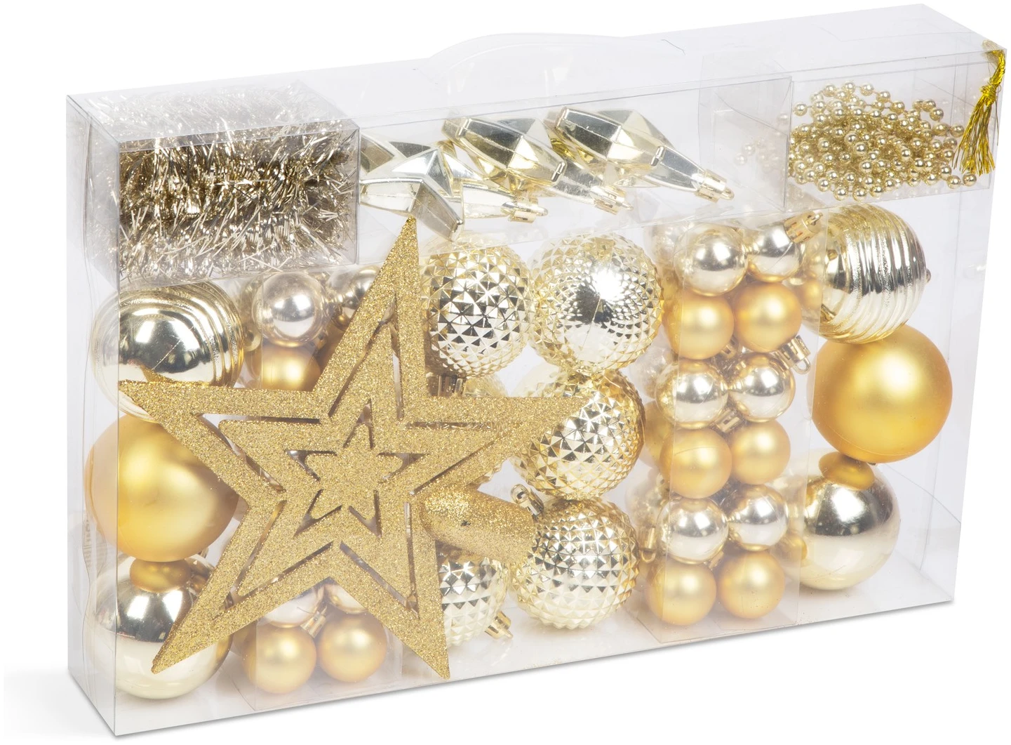 | Inhoud van het pakket: | 26 x matte bal, 34 x glanzende bal, 3 x glanzende ster. 1 x glinsterend top ornament 1m glanzende slinger 2m glanzende kralenketting |