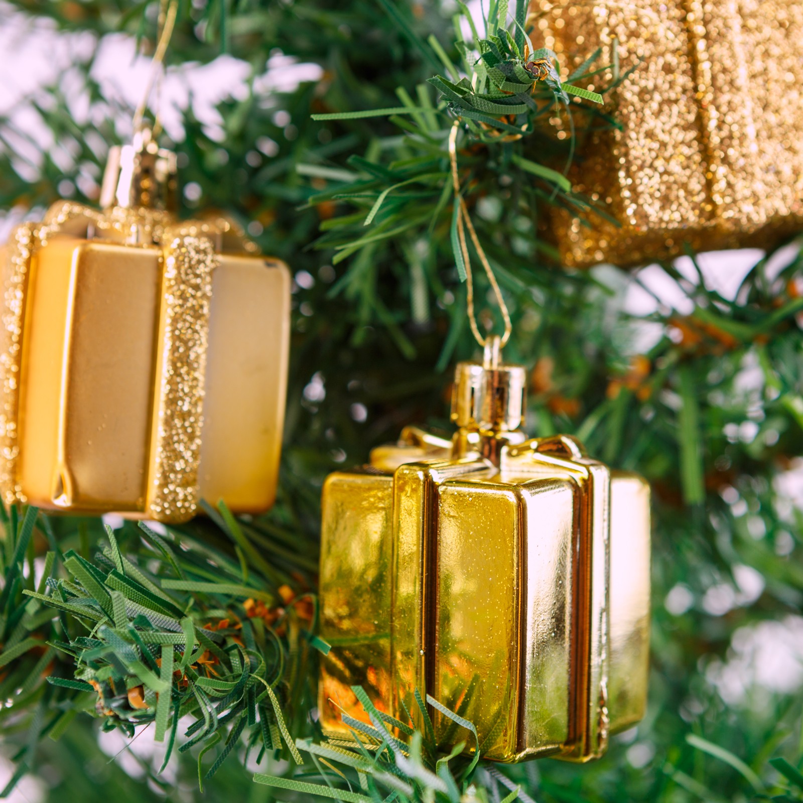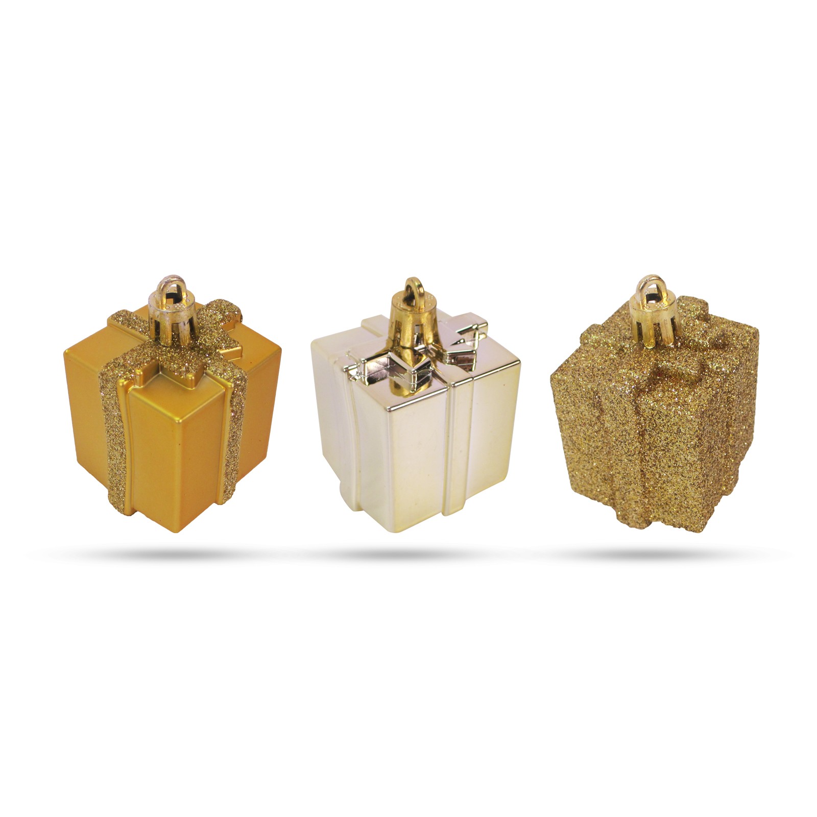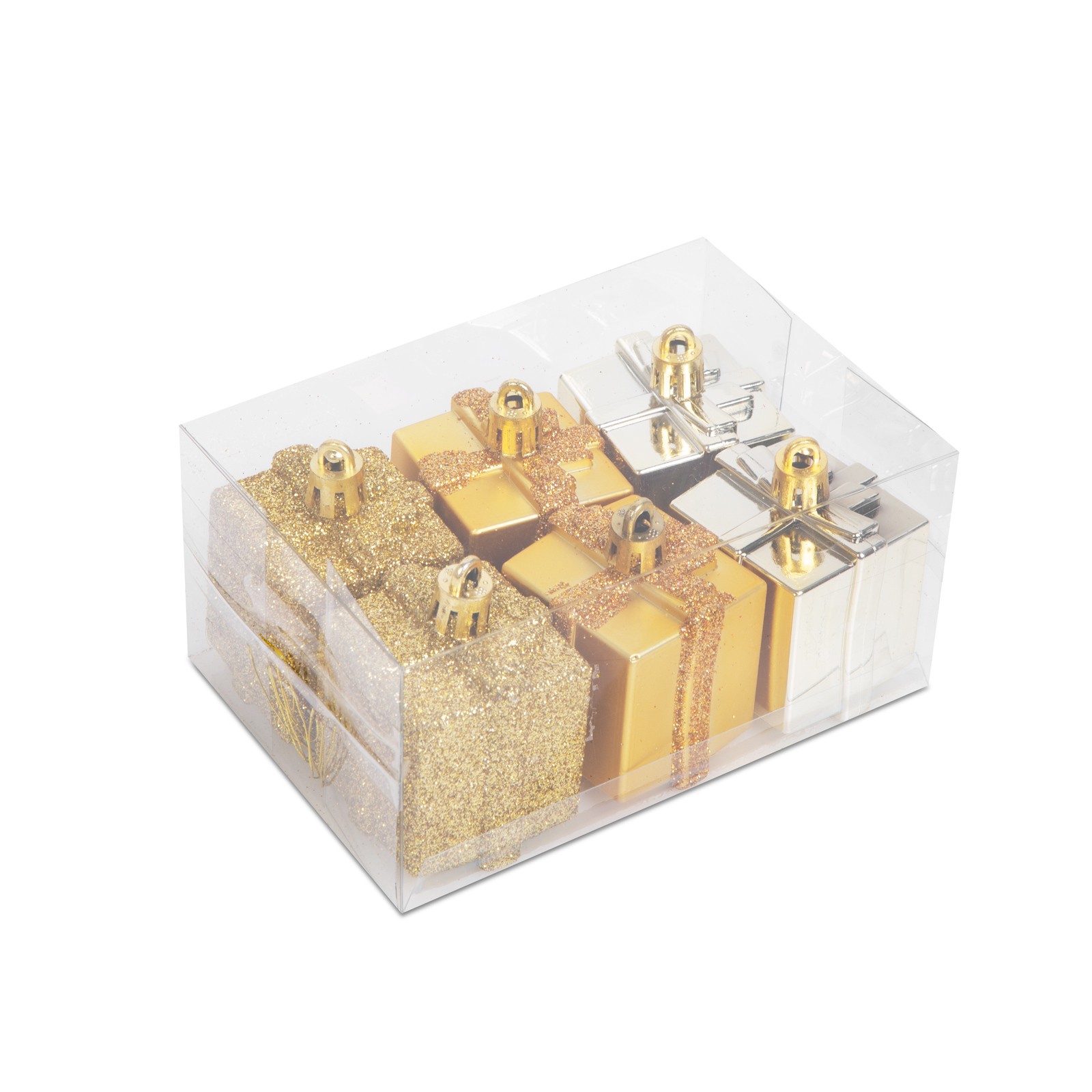 Kerstdecoratieset – 6 gouden cadeau-ornamenten (4,5 cm) – glanzend, mat & glitter – kunststof kerstversiering [58781A]