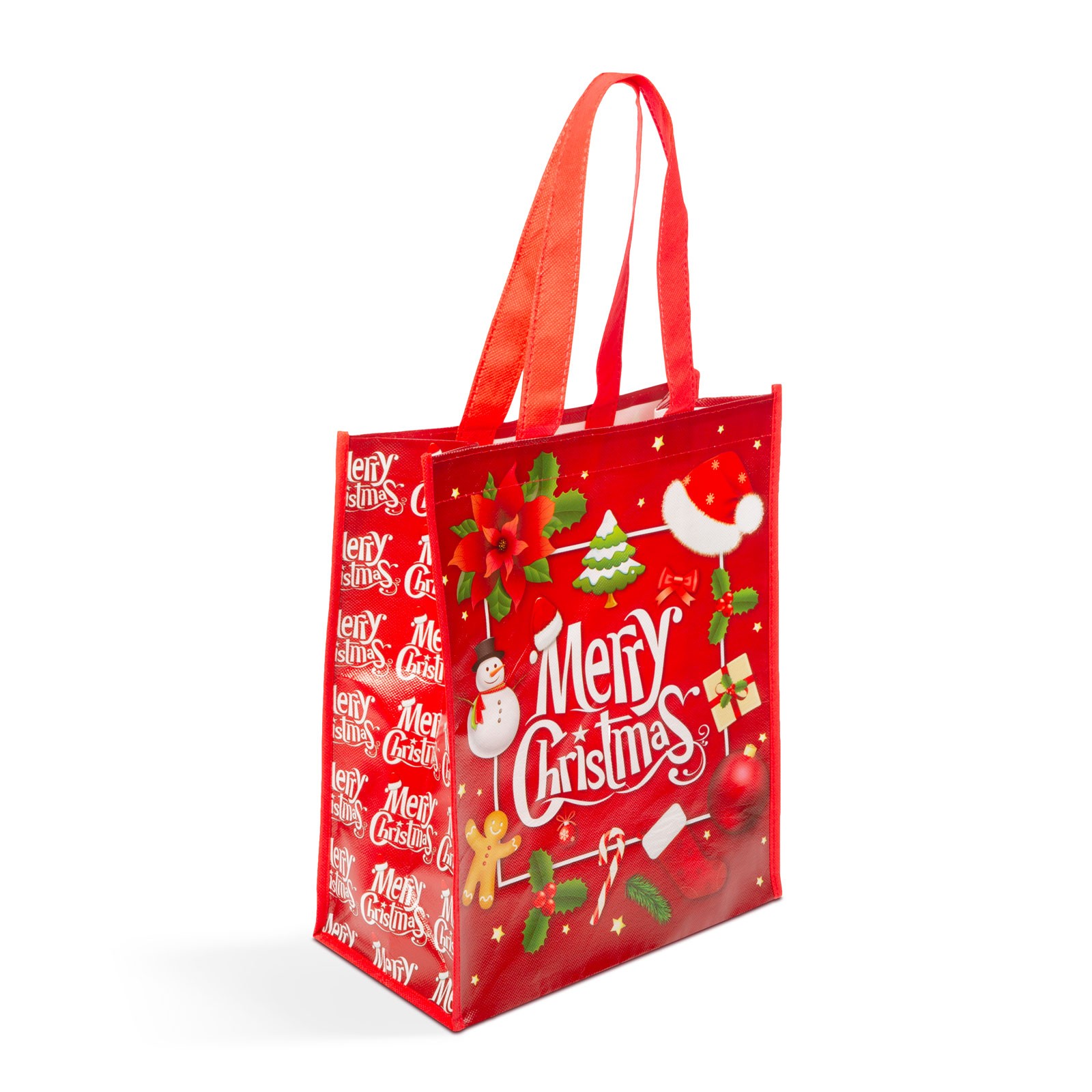 Maat: 270 x 330 x 120 mm Kleur: Rood Label: “Vrolijk Kerstfeest” Materiaal: Plastic Handvatlengte: 40 cm