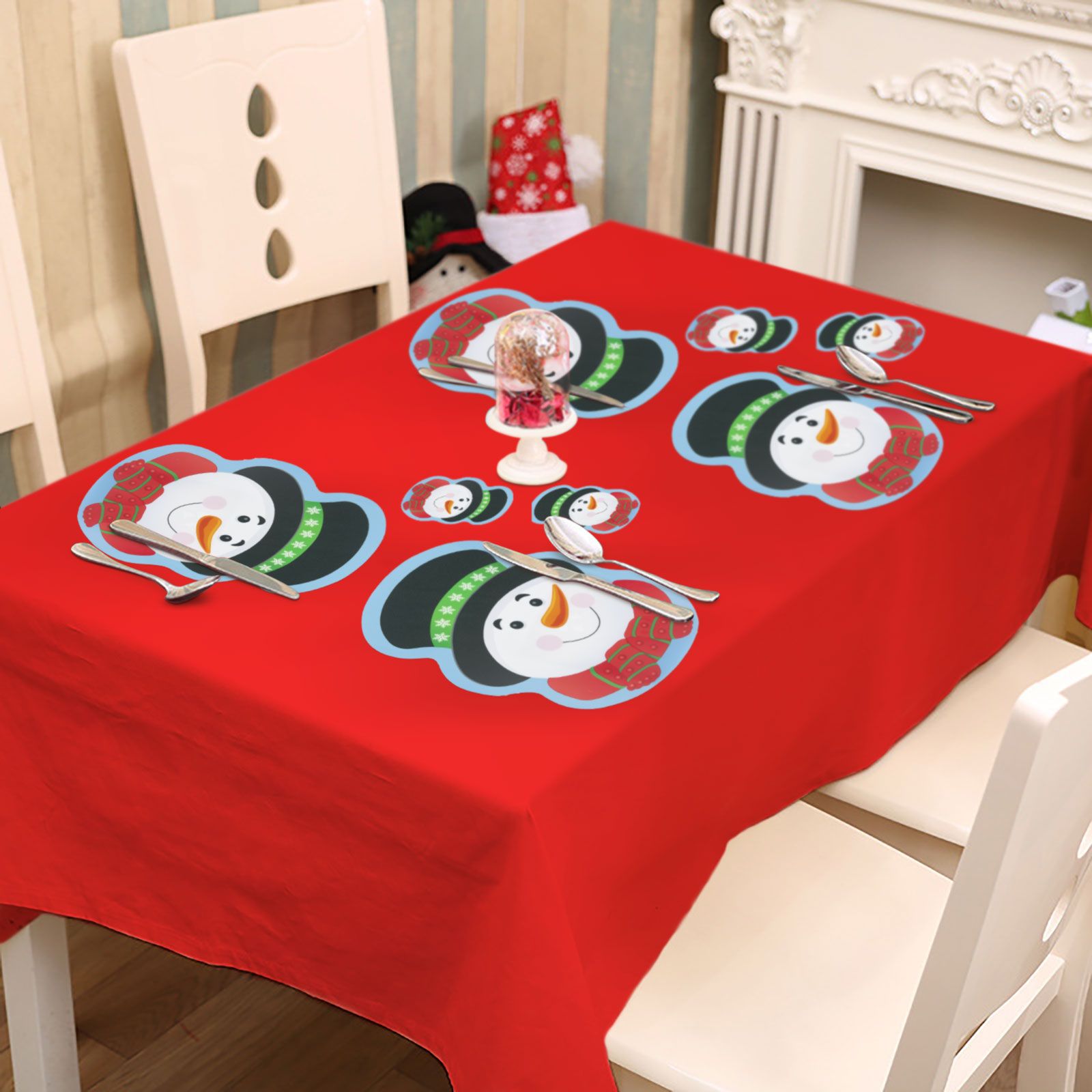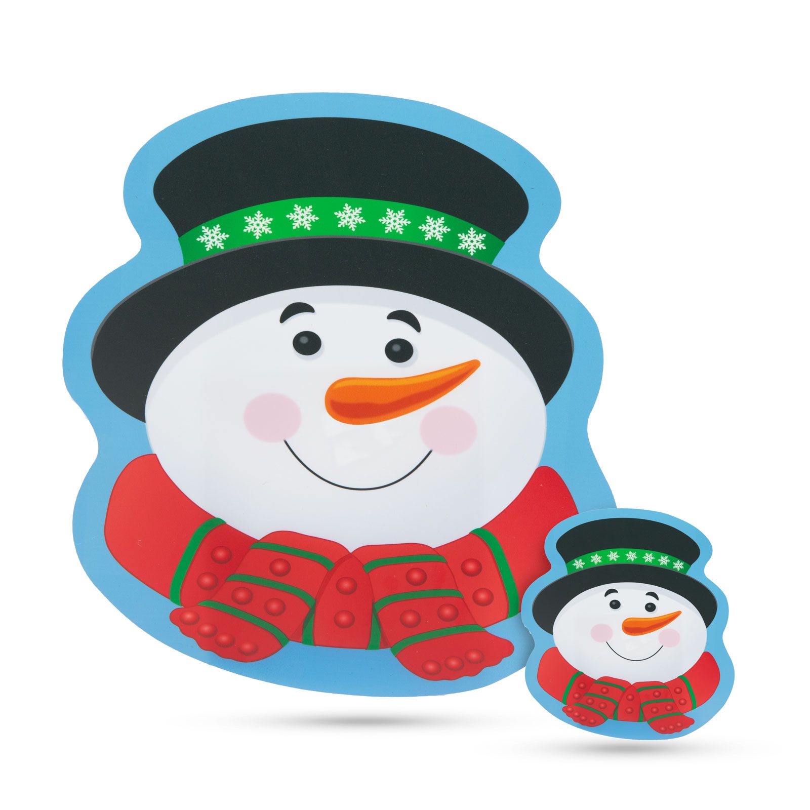 Kersttafelonderzetter met diverse patronen. De set bestaat uit 4 borden en 4 kleinere borden met lachende sneeuwpoppen.