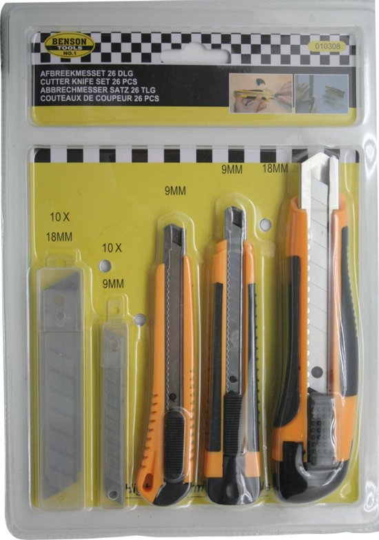 Zoekwoorden: Benson Stanleymes, Afbreekmessenset, reserve mesjes, snijklussen, hobbyisten, professionals, afbreekmes, veelzijdig, gebruiksvriendelijk, ergonomisch ontwerp.