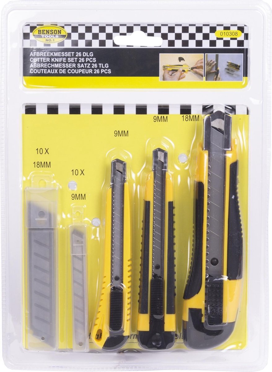 Ben je op zoek naar een veelzijdige en betrouwbare set afbreekmessen voor al jouw snijklussen? Zoek niet verder! De Benson Stanleymes Afbreekmessenset, inclusief reserve 9 en 18 mm mesjes, is de perfecte keuze voor zowel hobbyisten als professionals. Met deze 26-delige set kun je uiteenlopende materialen nauwkeurig en veilig snijden, van karton tot plastic en meer.