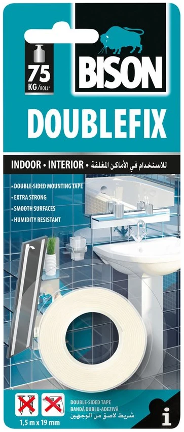Vochtbestendige, dubbelzijdige, zelfklevende foamtape van Bison voor montage op gladde oppervlakken of het ophangen van lichte voorwerpen. Het veroorzaakt geen oppervlakteschade en is waterdicht.