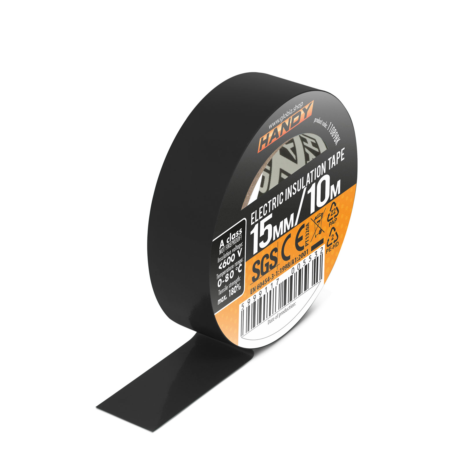 Materiaal: Materiaal: PVC + oplosmiddelacryllijm Lengte: 10 meter Breedte: 15 mm Dikte: 0,13 mm Standaard: EN 60454-3-1:1998/A1:2001,