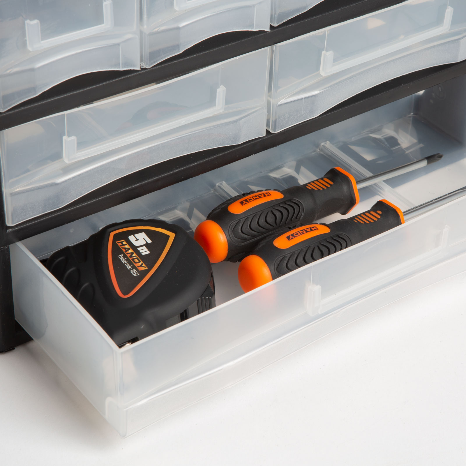 Effectief werken kan alleen onder ordelijke omstandigheden! Met deze draagbare organizer kunt u kleine onderdelen, schroeven, deuvels, spijkers, schakelaars of andere elektronische componenten die u nodig hebt voor uw werk, gescheiden houden op grootte en type. Dankzij de verdelers kunt u tot wel 24 soorten accessoires scheiden. Transparante en uitneembare lades zorgen voor een goed overzicht.