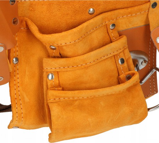 Het is gemaakt van natuurlijk zeem en blank leer, het is dubbel gestikt en extra versterkt met klinknagels.