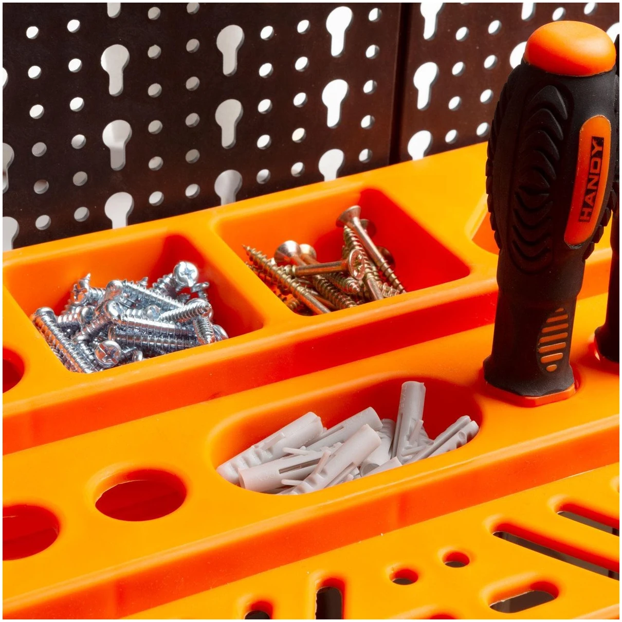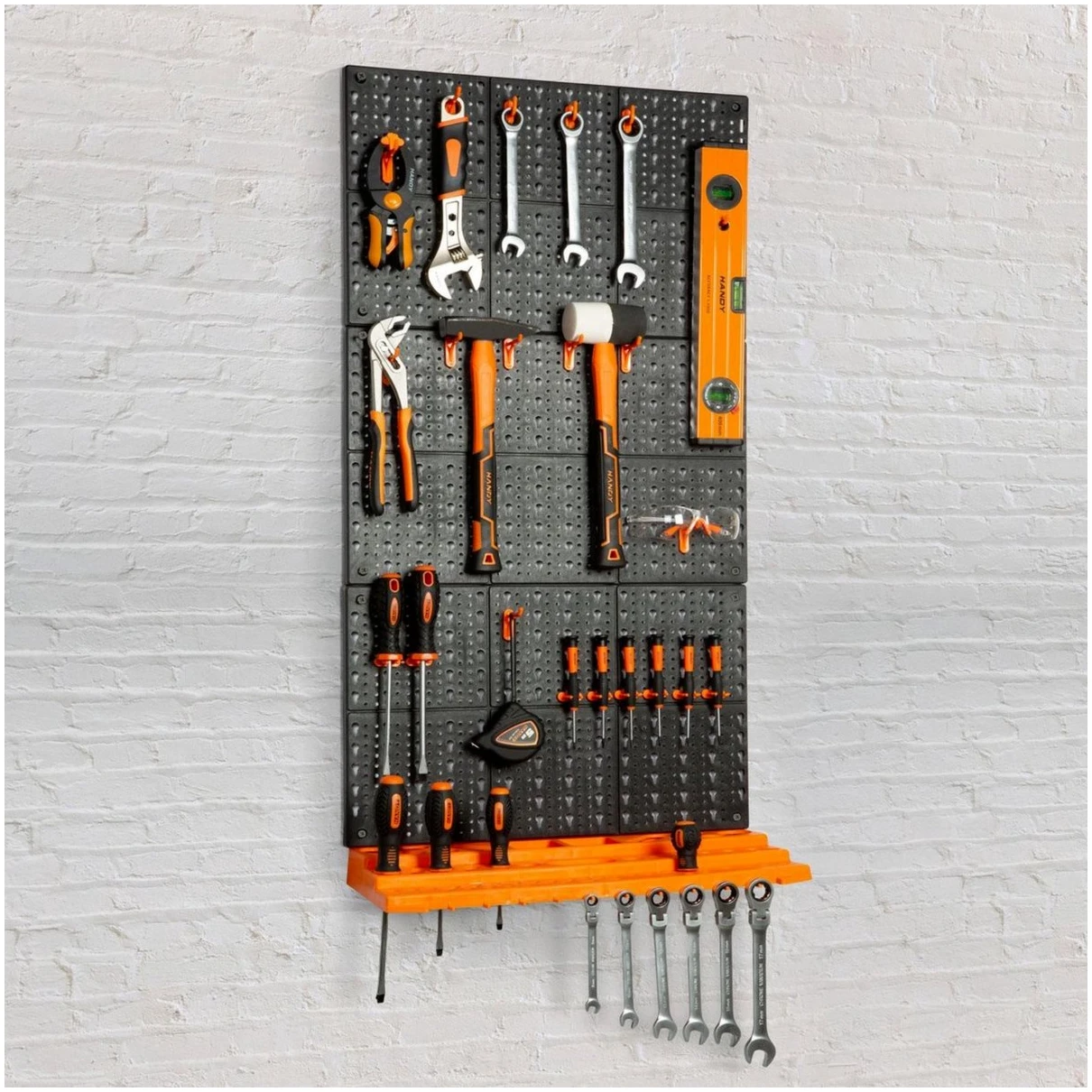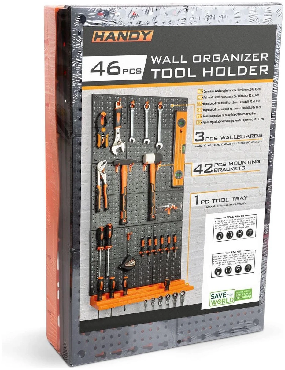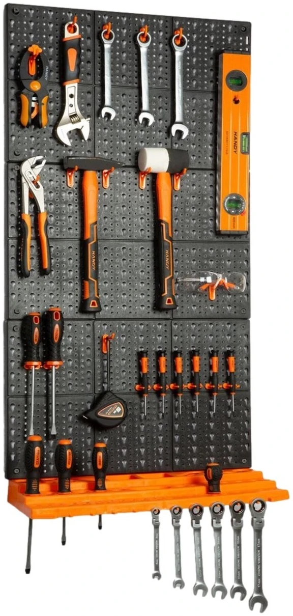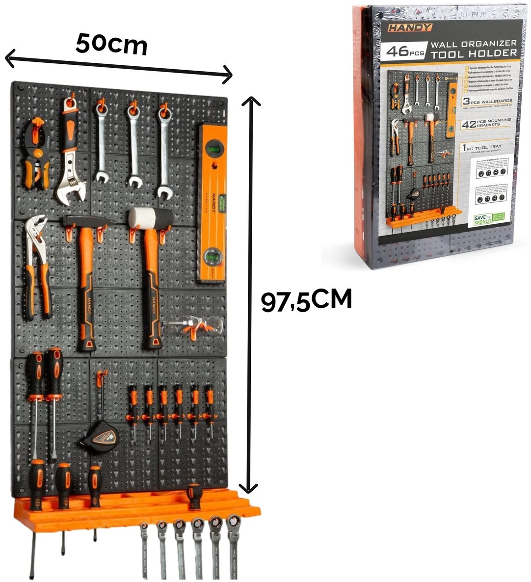 Organiseer je gereedschap zoals jij dat wil met de HANDY gereedschapswand! Stop met zoeken naar gereedschap of hobbytools in bijvoorbeeld een lade. Met de gereedschapswand van HANDY vind je gemakkelijk wat je zoekt! Verschillende lay outs mogelijk! De boards kunnen boven elkaar geplaatst worden zoals op de afbeeldingen maar kunnen bijvoorbeeld ook naast elkaar geplaatst worden om een bord van 32,5CM hoog en 150CM breed te maken. Afgebeeld is de lay out van 97,5CM hoog en 50CM breed.