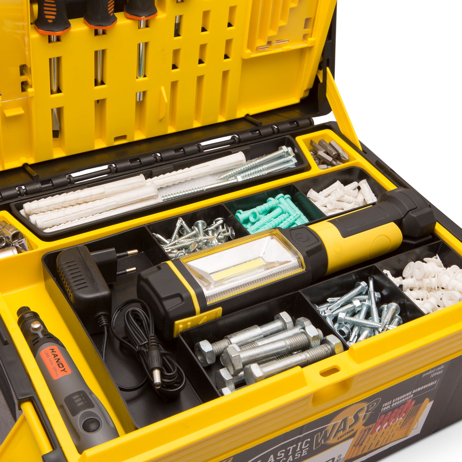 Dankzij het compacte formaat is hij gemakkelijk mee te nemen, maar toch heeft hij voldoende opbergvakken. Hij heeft een ingebouwde liniaal, waardoor u in noodsituaties nauwkeurige metingen kunt uitvoeren. Wanneer de koffer open is, bevindt zich aan de bovenkant een opbergvak voor boormachines en schroevendraaiers. Gebruiksvriendelijk: u hoeft niet de hele koffer te openen om het juiste gereedschap te vinden. Bovenin de gereedschapskist bevindt zich een uittrekbare lade met 6 kleine en 1 grote opberglade. De kunststof lade is uitneembaar, waardoor hij ideaal is voor het opbergen van schroeven en pluggen.