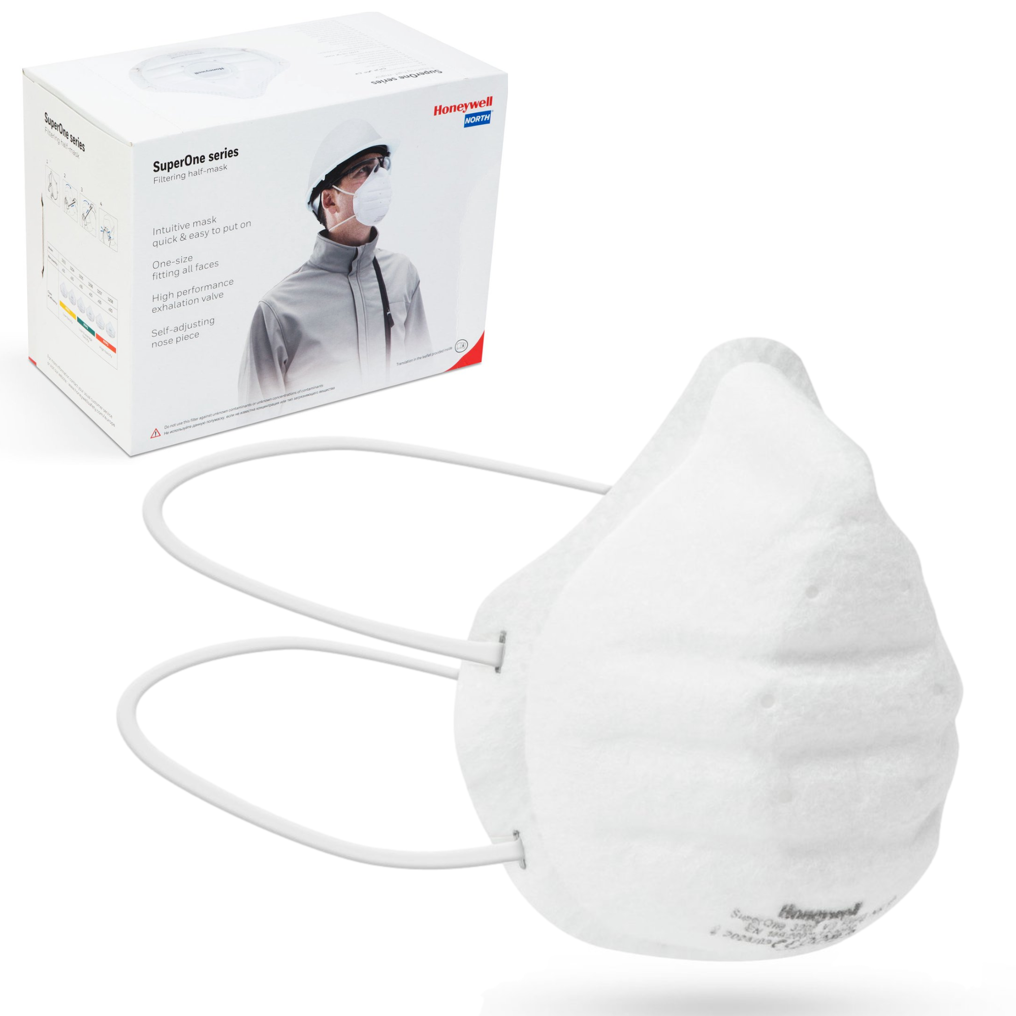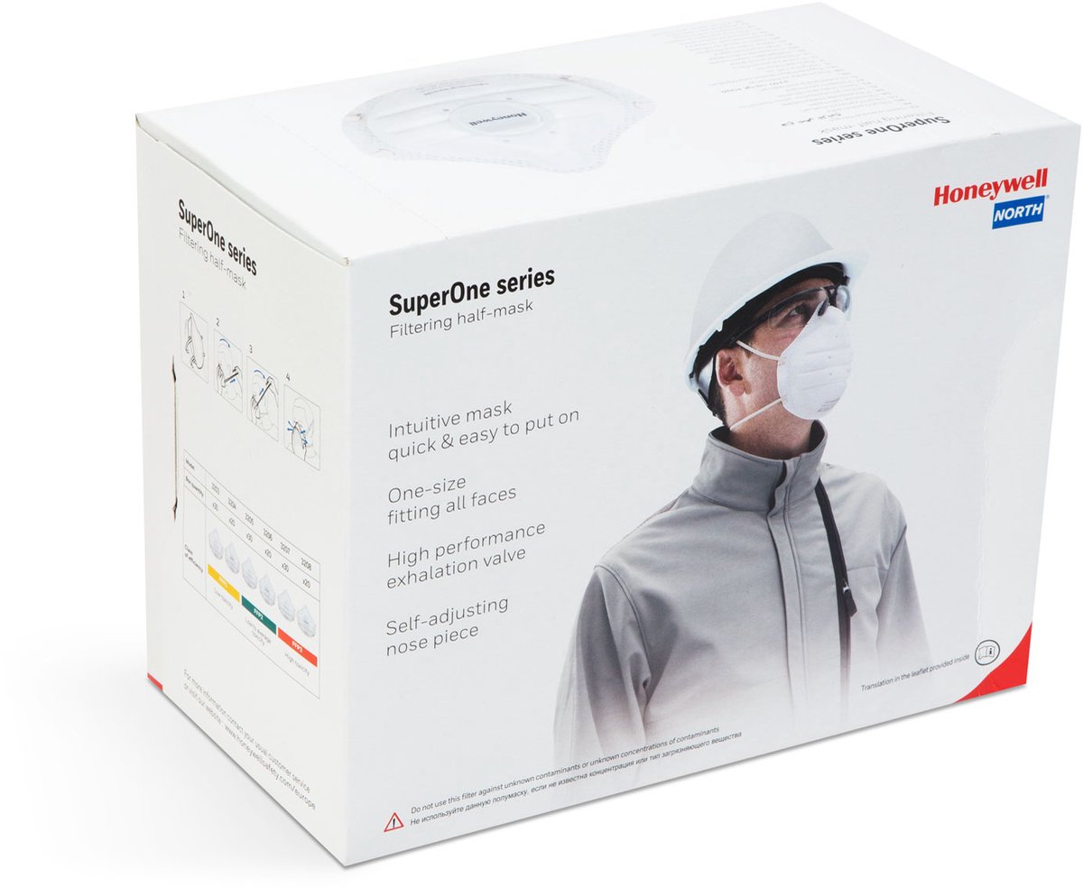 - De Honeywell SuperOne 3205 heeft een exclusief design, vorm. Het is een halfstijf masker met een voorgevormd bovenste deel, super licht en super zacht. Het comfortabele masker is snel en eenvoudig aan te passen, zeer efficiënt en veilig. Met dubbele soepele elastieken zo vastgezet dat lekkage en irritatie wordt voorkomen.