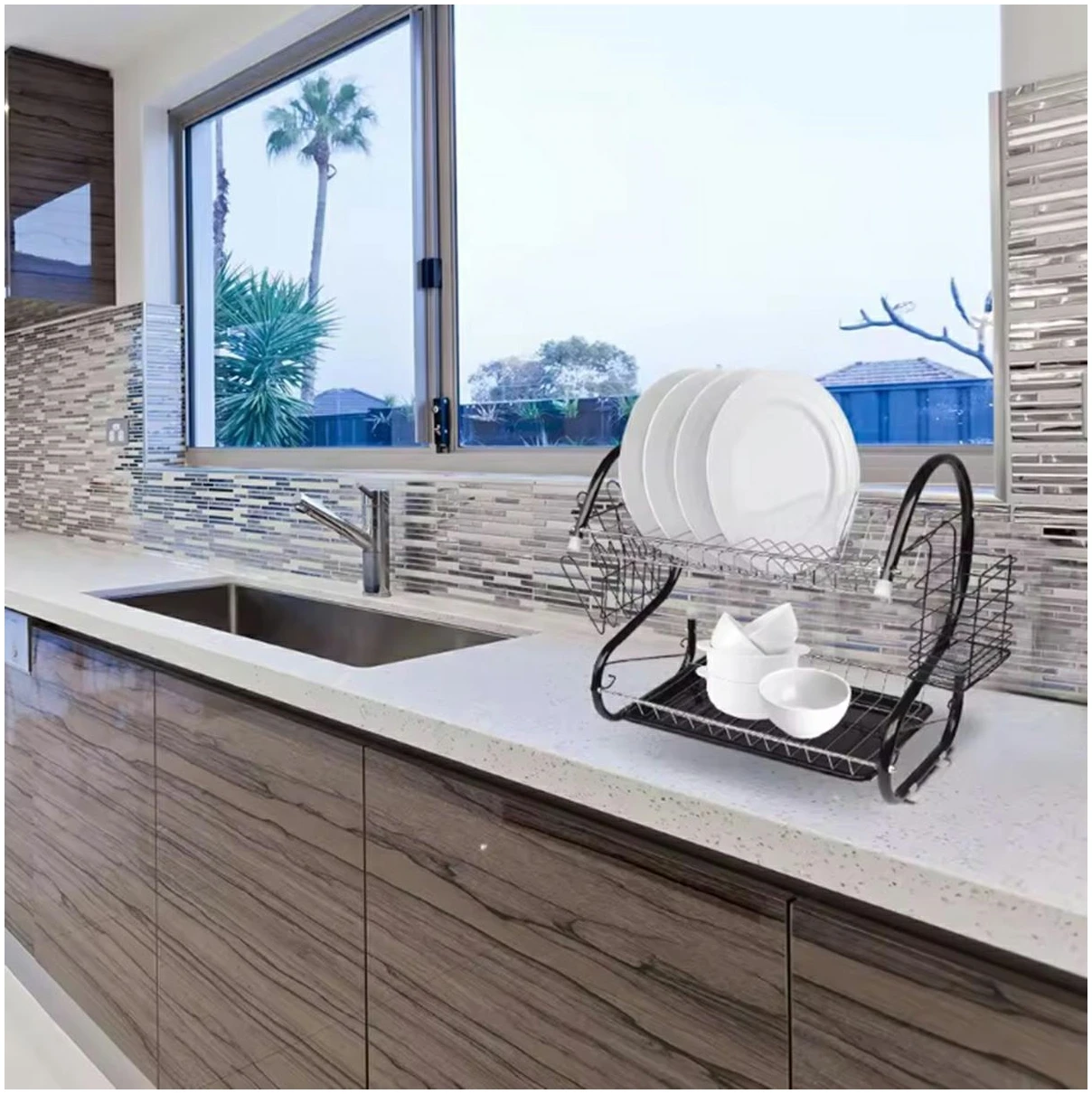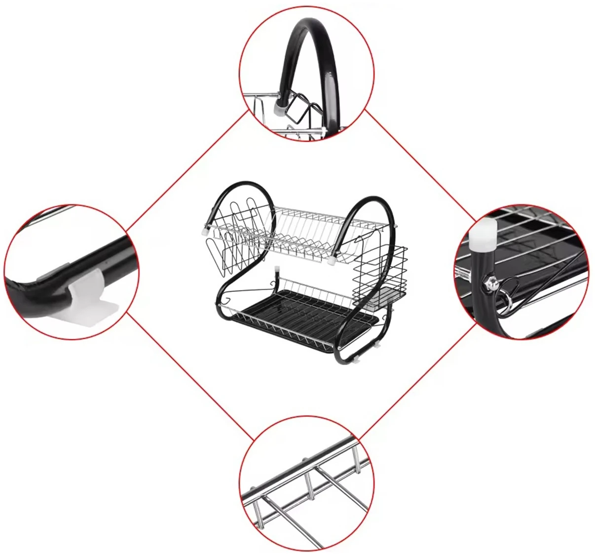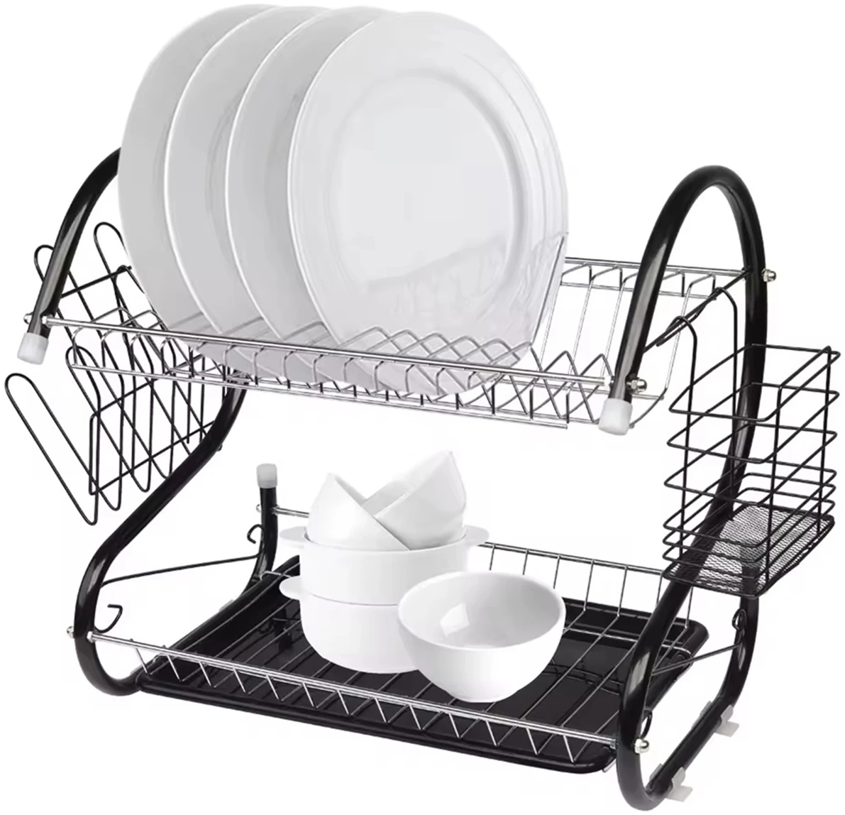 Borden- en bestekdroger met twee niveaus en afdruiprek. Op de bovenste verdieping kunnen gemakkelijk maximaal 15 borden worden geplaatst. Op het lagere niveau kunt u uw glazen en kopjes netjes ordenen. Hij is extreem ruim en onmisbaar in elke keuken! Er past een servies en bestekset in voor alle leden van het huishouden! Dankzij het compacte formaat verberg je hem gemakkelijk in het keukenkastje! Het heeft een aantal extra, verwijderbare elementen, b.v. een plastic bakje dat water opvangt, een extra bestekafdruiprek en een externe hanger die plaats biedt aan maximaal 6 glazen. Dit is een echte keukencombinatie die alle gerechten in uw keuken effectief zal organiseren!