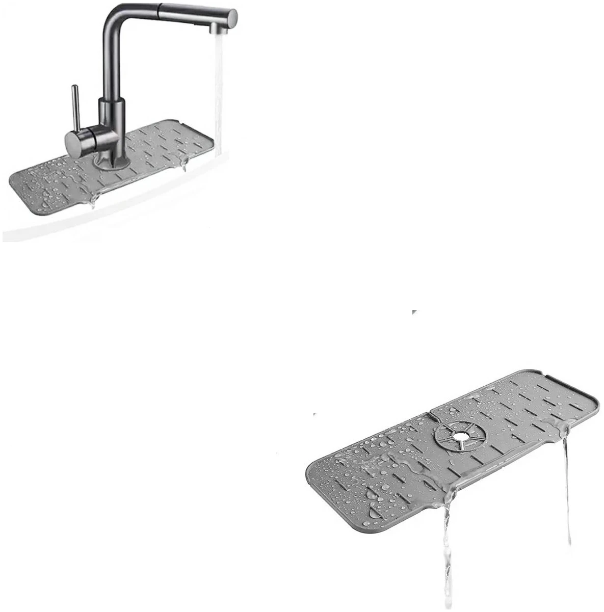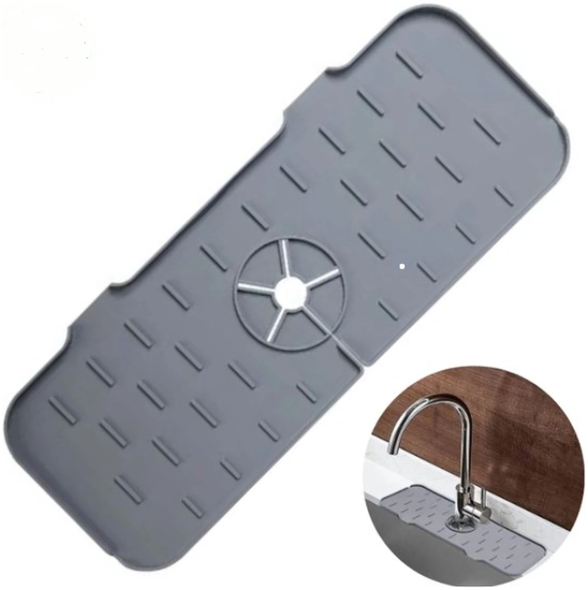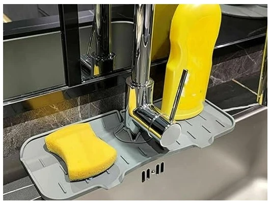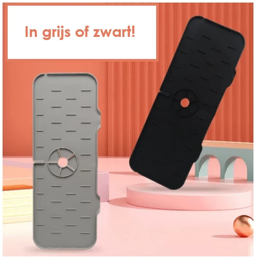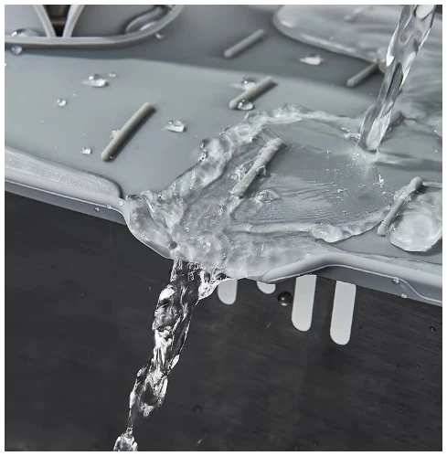 Siliconenmat voor om de kraan van de spoelbak. Beschermt het keukenwerkblad tegen nat worden. Helpt de waterstroom rechtstreeks in de afvoer met behulp van speciale reliëfs. Gemaakt van flexibel materiaal dat zich perfect aanpast aan de vorm van de spoelbak. Gemakkelijk schoon te houden: trek hem er gewoon uit en spoel af.